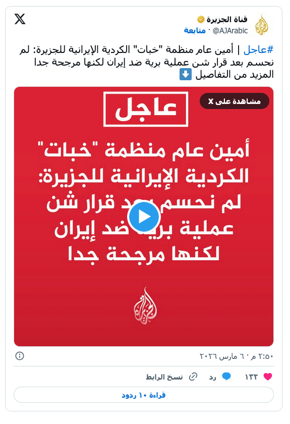 مقاتلون أكراد إيرانيون يشاركون في دورة تدريبية في معسكر قرب أربيل بالعراق (رويترز) عرب وعالم أكراد إيران على الجانب العراقي.. ماذا يريدون؟ ومم يخافون؟ by admin 7 March، 2026 written by admin 7 March، 2026 37 الجزيرة أفاد مصدر كردي إيراني لوكالة رويترز، اليوم الجمعة، أن الهدف النهائي للفصائل الكردية هو إقامة منطقة حكم ذاتي شبه مستقلة داخل إيران في إطار نظام فدرالي على غرار إقليم كردستان، في حين قال أمين عام منظمة خبات الكردية الإيرانية للجزيرة إنهم يتطلعون إلى دعم من الولايات المتحدة بأسلحة ومتفجرات ومعدات متقدمة. ونقلت رويترز عن المصدر الكردي أن القادة الأكراد “يخشون التخلي عنهم كما حدث للأكراد في سوريا”، مضيفا أنهم “طلبوا ضمانات من الولايات المتحدة”، دون تحديد طبيعتها. دعم أمريكي وأوضح مصدران كرديان لرويترز أن التنسيق مع الولايات المتحدة أقوى منه مع إسرائيل وأن أي هجوم عبر الحدود سيتطلب دعما جويا من الطرفين، وقالا إن “الكرد لم يحصلوا بعد على أسلحة لكنهم سيطلبون أنظمة دفاع جوي ومسيّرات وأسلحة خفيفة ودعما مدفعيا”. وتبلغ القوة المشتركة للمقاتلين الأكراد ما بين 5 و6 آلاف مقاتل، بحسب مصادر مستقلة، والآلاف منهم يتجمعون على الجانب العراقي من الحدود ويستعدون لشن هجوم خلال أسبوع. ووفقا للمصادر الكردية، فإن هؤلاء المقاتلين لا يمتلكون سوى أسلحة خفيفة، مضيفة أنهم “قد لا يمتلكون القوة النارية الكافية لشنّ محاولة جادة للحكم الذاتي لكنهم قد يُثيرون اضطرابات على الحدود بدعم من الولايات المتحدة وإسرائيل”. وقال مصدر إسرائيلي “إن إسرائيل لا تتوقع منهم القدرة على الإطاحة بالحكومة، لكن دعمهم قد يُضعف سيطرة إيران على المناطق الداخلية ويُشتت جهود الحرس الثوري الإسلامي”، بحسب رويترز. معلومات استخبارية ونقلت رويترز، عن 3 مصادر مطلعة على المحادثات الإسرائيلية مع الفصائل الكردية الإيرانية، أن إسرائيل تقصف أجزاء من غرب إيران لدعم هذه الفصائل التي تأمل في استغلال الحرب الأمريكية الإسرائيلية على إيران للسيطرة على بلدات قرب الحدود. وقالت الوكالة إن فكرة شنّ هجوم من قبل القوات الكردية الإيرانية المتمركزة في العراق برزت، عندما صرح الرئيس الأمريكي دونالد ترمب لرويترز أنه سيكون من “الرائع” لو عبرت هذه القوات الحدود. وقال مصدران كرديان إيرانيان للوكالة -شريطة عدم الكشف عن هويتهما- إن إسرائيل تجري محادثات مع جماعات كردية إيرانية متمردة تتمركز في إقليم كردستان العراق منذ نحو عام، في حين وصف مصدر إسرائيلي المحادثات بأنها “طويلة الأمد”. وأفادت 3 مصادر بأن “الأكراد داخل إيران يزوّدون الولايات المتحدة وإسرائيل بمعلومات استخباراتية حول استهداف المناطق الحدودية”. وقال أحد المصادر الكردية الإيرانية إن القادة الأكراد يخشون التعرض لـ”خيانة” مماثلة لتلك التي تعرضت لها الجماعات الكردية في شمال سوريا، والتي “أُجبرت على التنازل عن أراضٍ بعد أن كانت لفترة طويلة الشريك الرئيسي للولايات المتحدة في المنطقة”، مضيفا بأن القادة الأكراد الإيرانيين “طلبوا ضمانات من الولايات المتحدة” دون تحديد ماهيتها. عملية برية مرجحة في السياق ذاته، قال أمين عام منظمة خبات الكردية الإيرانية للجزيرة إن الأمريكيين تواصلوا معهم عبر قنوات دون حدوث لقاء مباشر بعد، مضيفا أن قرار شن عملية برية ضد إيران لم يحسم بعد لكنه مرجح جدا. وأضاف أن الأمريكيين سألوا عما يجب فعله مع النظام الإيراني والخيارات وعن إمكانية التعاون مستقبلا. وعبر أمين عام منظمة خبات عن التطلع إلى دعم من الولايات المتحدة بأسلحة ومتفجرات ومعدات متقدمة، مؤكدا احترام سيادة إقليم كردستان “لكن لا ينبغي له أن يقف في طريقنا” بحسب وصفه. المصدر: الجزيرة + رويترز 0 comment 0 FacebookTwitterPinterestEmail admin previous post (7 أيام من الحرب.) . تسلسل زمني لضربات متبادلة غيرت وجه المنطقة next post الدولار الأميركي ينتفض ويسجل مكاسب قياسية أمام الجنيه المصري You may also like علي بردى يكتب عن: ترمب يتوعد ك