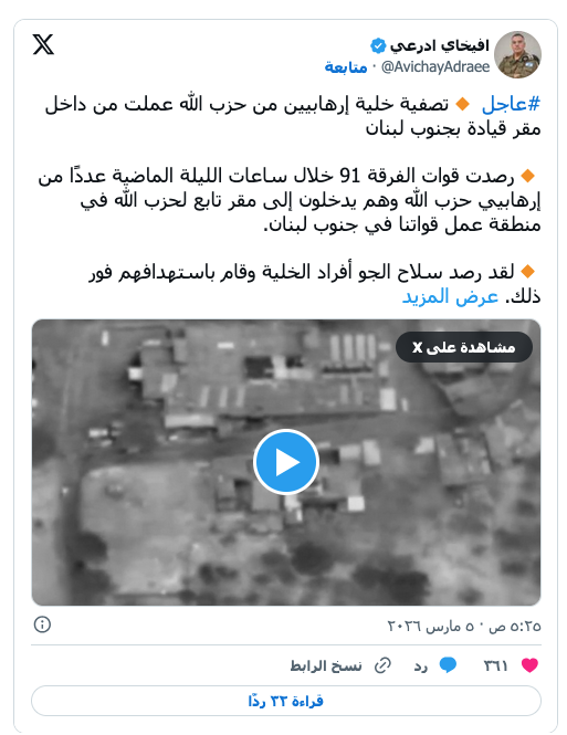 نتنياهو محاطاً بوزير الدفاع يسرائيل كاتس ورئيس أركان الجيش إيال زامير خلال زيارة لقاعدة بالماخيم الجوية الإسرائيلية في 3 مارس الحالي (حساب رئيس الوزراء الإسرائيلي على إكس) عرب وعالم إسرائيل في جنوب لبنان توسع الوجود وبنك الأهداف by admin 6 March، 2026 written by admin 6 March، 2026 49 تل أبيب تستعد لإمضاء فترة طويلة في الأراضي اللبنانية وتبحث إدراج مواقع مدنية على قائمة الاستهداف اندبندنت عربية / أمال شحادة أجرى الكابينت الإسرائيلي اجتماعاً مقلصاً لتقييم الوضع تجاه لبنان تطرق فيه إلى إمكان إدراج أهداف مدنية ضمن بنك أهداف العملية المخصصة للقضاء على “حزب الله” وسلاحه، كوسيلة ضغط على الحكومة اللبنانية لاتخاذ إجراءات تضمن تجريد الحزب من سلاحه. وصرح مسؤول أمني، في ساعة متاخرة من مساء أمس الأربعاء، أن سيناريوهات عدة مطروحة للبحث على الطاولة تجاه لبنان بعدما اتخذ القرار بعدم مغادرة الأرض اللبنانية قبل تحقيق “واقع جديد”، يتمثل بالقضاء كلياً على “حزب الله” وسلاحه. لكن هذا الواقع الذي تسعى إسرائيل إلى تحقيقه في لبنان في عملياتها الحالية يواجه نقاشاً كبيراً داخل إسرائيل تزايد خلال الساعات الـ24 الأخيرة عندما استخدم الحزب، وفق الجيش الإسرائيلي، صاروخاً عنقودياً ونفذ عمليات قصف مشتركة مع إيران، دخل إثر واحدة منها ملايين الإسرائيليين إلى الملاجئ، وفق ما جاء من الجبهة الداخلية. ونقل تقرير إسرائيلي عن مسؤول أمني قوله إن توقعات أجهزة الاستخبارات والأجهزة الأمنية لقدرات “حزب الله“، قبل اتخاذ قرار إعلان انضمام الجبهة اللبنانية إلى حرب “زئير الأسد”، كانت خاطئة. الوزير الكين: إلى ما بعد الليطاني الأهداف المدنية، التي طرحها الإسرائيليون على طاولة البحث جاءت بعدما كان الجيش الإسرائيلي قد بدأ بتنفيذ عمليته البرية في لبنان وتكثيف جهوده لإنهاء المرحلة الأولى منها التي تشمل احتلال جنوب لبنان، عبر تعبئة المنطقة بجنود فرقتين من الاحتياط والجيش النظامي عند الحدود وفي لبنان. فعلى رغم التحديات التي تواجهها إسرائيل في حرب “زئير الأسد” ضد إيران وتجنيد معظم طيرانها ومنظومة دفاعها، إلا أنها رفعت التأهب على الجبهة الشمالية تجاه لبنان، إلى أولويات المؤسسة العسكرية، وبدأت المرحلة الأولى من عمليتها البرية، التي تشمل تنفيذ توغلات برية في عمق الجنوب اللبناني على طول الحدود. في بداية نشر قواتها، وبعد أقل من 24 ساعة على إطلاق “حزب الله” أولى صواريخه على إسرائيل، أعلنت تل أبيب أنها تنفذ خطة في جنوب لبنان أطلقت عليها اسم “الدفاع الأمامي لسكان الشمال”. بموجبها تنتشر قوات عسكرية على مساحة واسعة في الجنوب يرافقها تنفيذ غارات مكثفة على بنى تحتية تابعة لـ”حزب الله” وإنشاء منطقة خالية من السكان على أن يسيطر عليها الجيش الإسرائيلي عبر قوات معززة وضمان تجريدها من السلاح والبنى التحتية للحزب، لتكون فاصلة عن بلدات الشمال، يقوم من خلالها الجيش بالدفاع عن بلدات وسكان الشمال ويضمن عدم إطلاق صواريخ من هناك، وعدم تسلل عناصر “فرقة الرضوان” (قوات النخبة في الحزب)، وفق ما أكد مسؤول عسكري. كما قررت الأجهزة الأمنية الإسرائيلية تعزيز المواقع الخمسة التي يسيطر عليها الجيش بقوات عسكرية تضمن سيطرة إسرائيلية كاملة على أوسع منطقة لبنانية، وفي الوقت نفسه رصد عناصر “حزب الله” وتكثيف العمليات بتدمير بنى تحتية ومخازن أسلحة. وفي اجتماع تقييمي بمشاركة قيادة منطقة الشمال وهيئة الأركان، تقرر تكثيف وتسريع تنفيذ الخطة بما يضمن السيطرة على كل الجنوب، بحسب ما قال عضو الكابينت، الوزير زئيف الكين، الذي أكد أن الجيش لن يتوقف عن التقدم في الأراضي اللبنانية والتوغل فيها حتى إلى ما بعد نهر الليطاني. وهدد الكين بعدم التوقف عن عمليات القصف والتوغل وعدم الانسحاب من المناطق التي يسيطر عليها الجيش، قبل ضمان “سحق حزب الله” وتصفية قياداته السياسية والعسكرية. وكشف الكين عن أن الجيش الإسرائيلي ومن خلال بنك أهداف سلاح الجو سيركز، في م
