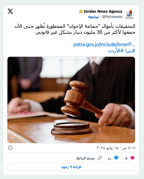 صورة تعود لعام 2011 لمقار مكاتب لجماعة الإخوان في الأردن وذراعها السياسية حزب «جبهة العمل الإسلامي» في عمّان (أ.ف.ب) عرب وعالم «الإخوان» في الأردن أمام مساءلة قانونية قد تطول قيادات الصف الأول by admin 16 July، 2025 written by admin 16 July، 2025 206 صمت حزب «جبهة العمل الإسلامي» في مواجهة تهم قضائية الشرق الاوسط / عمّان: محمد خير الرواشدة شهدت أزمة جماعة الإخوان المسلمين في الأردن تطورات جديدة خلال الساعات الماضية، بعدما وجهت السلطة القضائية تهماً مباشرة للجماعة المحظورة بارتكاب سلسلة تجاوزات قانونية ومالية. وكانت السلطات الأردنية بدأت في أبريل (نيسان) الماضي تحقيقات ضد نشاطات الجماعة، على خلفية مداهمات نفذتها قوى أمنية. وبالتوازي مع إعلان الحكومة «حظر نشاطات ما تسمى جماعة الإخوان المسلمين وعدّها جمعية غير مشروعة»، برز تصعيد رسمي تدريجي «مرتبط بحراك مؤازري الجماعة وذراعها الحزبية، حزب جبهة العمل الإسلامي»، بحسب مصادر تحدثت لـ«الشرق الأوسط». ووجهت السلطة القضائية، الثلاثاء، تهماً مباشرة للجماعة المحظورة بعد كشف التحقيقات الأولية عن سلسلة تجاوزات قانونية ومالية نتيجة متابعة شبكة تحويلات للخارج لأموال تم جمعها من أموال التبرعات. وقالت الجهات المختصة في بيان نشرته «وكالة الأنباء الأردنية» (بترا) إن هناك «نشاطاً مالياً غير قانوني ضلعت به جماعة الإخوان المسلمين المحظورة طوال الأعوام الماضية داخلياً وخارجياً، تزايدت وتيرته في آخر 8 سنوات». وتواصل السلطات الأردنية الكشف عن تجاوزات متعلقة بملف جماعة الإخوان في الأردن، وسط أجواء من الصدمة والترقب داخل صفوف الجماعة وذراعها السياسية، حزب جبهة العمل الإسلامي، أمام الإجراءات التي بدأت تتخذها السلطات المعنية في إطار قانوني لم يسبق أن عاشته الجماعة من قبل. ويأتي ذلك في ظل مخاوف من أن يطول التحقيق توقيف ومحاكمة عدد من قيادات الصف الأول في الجماعة، بحسب ما قالت مصادر مطلعة لـ«الشرق الأوسط». وأثارت سلسلة الاتهامات التي وجهتها السلطة القضائية للجماعة أسئلة تتعلق بمصير حزب جبهة العمل الإسلامي الذي التزم الصمت في قضية حل الجماعة والملاحقة القانونية لأموالها وجميع الأصول التي تملكها. وفي هذا الإطار، جاء من ضمن الاتهامات أن «الأموال التي يتم جمعها وصرفها بشكل غير قانوني تستخدم لغايات سياسية وخيرية ذات مآرب سياسية، فقد كانت تُصرف على أحد الأحزاب وعلى الأدوات والأذرع والحملات الإعلامية وعلى الفعاليات والاحتجاجات، والتدخل في الانتخابات النقابية والطلابية، وصرف مرتبات شهرية لبعض السياسيين التابعين للجماعة وعلى حملاتهم الدعائية». ويمهد ما جاء في الاتهامات التي أُعلن عنها الثلاثاء لقرار مرتقب بـ«حل نقابة المعلمين» التي سيطرت الجماعة وذراعها الحزبية على قيادتها خلال الدورات الثلاث السابقة، بعد استئناف عمل النقابة خلال حراك للمعلمين بدأ منذ في مارس (آذار) عام 2010. وانتزع الحراك وقتها قراراً بإعادة عمل النقابة في عام 2011، وعدّها «هيئة نقابية مهنية ذات شخصية اعتبارية، وتضم المعلمين والمعلمات الأردنيين». تفاصيل شغلت الرأي العام وتابع الأردنيون باهتمام ملحوظ ما أعلنته السلطات المختصة من تحقيقات بخصوص «وجود نشاط مالي غير قانوني ضلعت به جماعة الإخوان المسلمين». وجاء في التحقيقات الأولية أن الجماعة «أدارت شبكة مالية ضخمة ومعقدة كانت تتأتى مواردها من مصادر عدة أبرزها؛ جمع التبرعات التي كانت تقوم بها جمعيات تنشط في هذا المجال بشكل غير قانوني، ومن عوائد استثمارات أقيمت بشكل مباشر وبالباطن داخل المملكة وخارجها، بالإضافة إلى الاشتراكات الشهرية من داخل الأردن وخارجه». كما أثبتت التحقيقات والمضبوطات أن الجماعة التي يُفترض أنها منحلة وعملها غير قانوني، وهو ما أكده قرار محكمة التمييز الصادر عام 2020، حازت وتحت عناوين مختلفة، عشرات الملايين من الدنانير استُثمر جزء منها في شراء شقق خارج الأردن، كما استُخدمت الأموال لأغراض غير مشروعة قانوناً، 