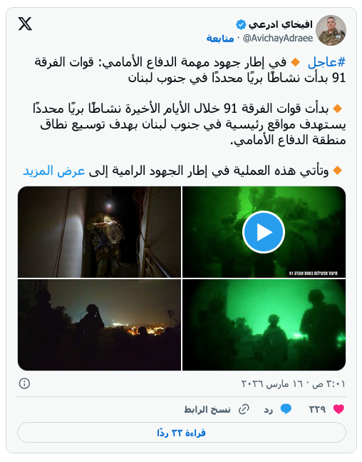 عرب وعالم الجيش الإسرائيلي بدأ نشاطا بريا محددا ضد “حزب الله” بجنوب لبنان by admin 16 مارس، 2026 written by admin 16 مارس، 2026 19 غارات جديدة على الضاحية الجنوبية وبريطانيا تقدم تمويلاً طارئاً بنحو 6 ملايين دولار لبيروت اندبندنت عربية / وكالات https://canadavoice.info/wp-content/uploads/2026/03/الجيش-الاسراييلي-بدا-نشاطا-بريا-محددا-ضد-حزب-الله-بجنوب-لبنان-ان.mp4 أعلن الجيش الإسرائيلي اليوم الإثنين أنه بدأ في الأيام الأخيرة ما وصفه بـ”نشاط بري محدد” ضد “حزب الله” في جنوب لبنان. وقال الجيش في بيان “بدأت قوات الفرقة 91 خلال الأيام الأخيرة نشاطاً برياً محدداً يستهدف مواقع رئيسة في جنوب لبنان بهدف توسيع نطاق منطقة الدفاع الأمامي”. وأشار البيان الذي نشره الجيش الإسرائيلي عبر منصة “إكس” إلى أن هذه العملية تأتي “في إطار الجهود الرامية إلى ترسيخ منطقة الدفاع الأمامية وتشمل تدمير بنى تحتية إرهابية والقضاء على عناصر إرهابية تعمل في المنطقة، وذلك بهدف إزالة التهديدات وخلق طبقة أمنية إضافية لسكان الشمال”. وأشار الجيش إلى أنه هاجم قبيل دخول قواته، “من خلال قوات المدفعية وسلاح الجو عديداً من الأهداف الإرهابية في المنطقة لإزالة التهديدات”. وأضاف، “تواصل قوات الفرقة إلى جانب الجهود الهجومية بتنفيذ مهمة الدفاع عن بلدات الجليل إلى جانب قوات الفرقة 146. وسيواصل الجيش العمل بقوة ضد ’حزب الله’ الذي قرر الانضمام إلى المعركة والعمل تحت رعاية نظام إيران ولن يسمح بالمساس بمواطني دولة إسرائيل”. غارات على “الضاحية” وشنت إسرائيل غارات جديدة على الضاحية الجنوبية لبيروت في وقت مبكر اليوم الإثنين، فيما قال الجيش الإسرائيلي إنه يستهدف بنى تحتية تابعة لـ”حزب الله” بعد ضربات سابقة استهدفت بصورة رئيسة جنوب البلاد. وتأتي الضربة التي شنت منتصف الليل وسُمع دويُّها في بيروت، بعد تحذير أصدره الجيش الإسرائيلي صباحاً بإخلاء الضاحية الجنوبية لبيروت، والتي قصفتها إسرائيل مراراً خلال الأسبوعين الماضيين. بعد وقت قصير من الغارة قال الجيش الإسرائيلي على وسائل التواصل الاجتماعي إنه “يهاجم بنى تحتية إرهابية تابعة لمنظمة (حزب الله) الإرهابية في بيروت”. وبعد أسبوعين من اندلاع الحرب تواصل إسرائيل شن غارات على مناطق عدة في لبنان وتدفع بقواتها إلى مناطق في جنوبه محاذية لحدودها، بينما أعلن الحزب إطلاق صواريخ نحو قاعدة عسكرية جنوب تل أبيب، ويؤكد خوض عناصره اشتباكات مع الجنود الإسرائيليين. وأعلنت “اليونيفيل” تعرض قواتها “لإطلاق نار، يرجح أنه من قبل مجموعات مسلحة غير تابعة للدولة” في حوادث منفصلة أثناء قيامها بدوريات حول مواقعها في بلدات ياطر ودير كيفا وقلاوية، من دون وقوع إصابات في صفوفها، مضيفة أن دوريتين قامتا بالرد على مصادر النيران “دفاعاً عن النفس”. من جهته أفاد مصدر قريب من حركة “حماس” لوكالة الصحافة الفرنسية بأن “القيادي في حركة (حماس) وسام طه” قضى في غارة “باستهدافه في شقة سكنية بمبنى في صيدا” في وقت مبكر الأحد. وكانت وزارة الصحة أفادت بمقتل شخص وإصابة ثلاثة أطفال في هذه الغارة. وأدت الغارات الإسرائيلية على لبنان إلى مقتل 850 شخصاً، وفق حصيلة جديدة نشرتها وزارة الصحة اللبنانية الأحد. كما أكدت السلطات نزوح أكثر من 800 ألف شخص. في هذه الأثناء واصل “حزب الله” الإعلان عن شن هجمات على إسرائيل. وأعلن الأحد أنه استهدف “قاعدة بلماخيم الجوية جنوب تل أبيب والتي تبعد عن الحدود اللبنانية 140 (كيلومتراً) بصاروخ نوعي”، عقب عملية أخرى استهدفت “مجمع الصناعات العسكرية التابع لشركة رفائيل” في مدينة حيفا. وانجر لبنان إلى الحرب الدائرة بالشرق الأوسط في الثاني من مارس (آذار) عندما فتح “حزب الله” النار على إسرائيل، قائلاً إنه يسعى للثأر لمقتل المرشد الأعلى الإيراني على خامنئي. رجال الإنقاذ في موقع غارة إسرائيلية استهدفت مبنى في بلدة حارة صيدا بجنوب لبنان (أ ف ب) “محادثات خلال أيام” قال مسؤولان إسرائيليان أمس الأحد إن من المتوقع أن ت