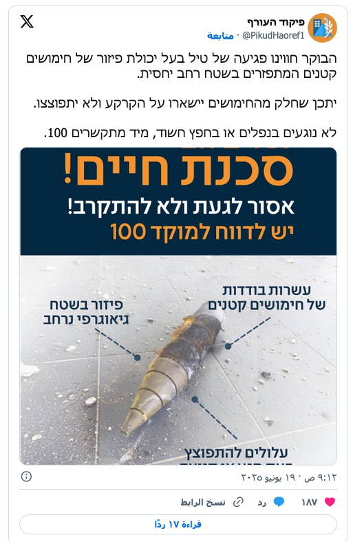 ذخيرة من قنبلة عنقودية إيرانية سقطت في وسط إسرائيل، 19 يونيو 2025. (Courtesy) عرب وعالم الجيش الإسرائيلي: صاروخ إيراني مزود برأس حربي عنقودي نشر القنابل في وسط إسرائيل by admin 21 يونيو، 2025 written by admin 21 يونيو، 2025 175 قيادة الجبهة الداخلية تقول إن الرؤوس الحربية ألقت حوالي 20 قذيفة بشكل عشوائي على نطاق 8 كيلومترات، وأصابت إحداها منزلا بينما لم تنفجر الأخرى لكنها لا تزال تشكل تهديدا تايمز اوف اسرائيل / إيمانويل فابيان قال الجيش الإسرائيلي إن صاروخا باليستيا واحدا على الأقل أطلقته إيران على إسرائيل في وابل من الصواريخ صباح الخميس كان يحمل رأسا حربيا عنقوديا، في تطور خطير جديد بعد ما يقرب من أسبوع من الهجمات. وقالت قيادة الجبهة الداخلية إن الرأس الحربي للصاروخ انقسم أثناء هبوطه، على ارتفاع حوالي 7 كيلومترات، وانتشرت حوالي 20 قذيفة أصغر في نطاق يبلغ حوالي 8 كيلومترات. ولا تحتوي هذه القذائف على محرك أو نظام توجيه خاص بها، وتسقط ببساطة على الأرض، حيث صممت لتنفجر عند الاصطدام. وقال مسؤول عسكري إسرائيلي إن مثل هذه الصواريخ تشكل تهديدا لمنطقة أوسع بكثير مقارنة برؤوس الصواريخ الباليستية الإيرانية الأخرى، لكن الانفجار الناتج عن كل قنبلة عنقودية يكون أصغر بكثير. أصابت إحدى الذخائر الصغيرة، التي تزن حوالي 2.5 كيلوغرام، منزلا في بلدة أزور وسط البلاد، مما تسبب في أضرار تعادل أضرار صاروخ صغير. ووفقا للمسؤول العسكري، لم تنفجر العديد من الذخائر الأخرى. ولا تزال الذخائر غير المنفجرة تشكل خطرا على أي شخص يصادفها. وقالت قيادة الجبهة الداخلية إن خبراء المتفجرات عثروا على 20 قنبلة وأزالوها، لكنها حذرت من أنها لا تستطيع التأكد من عدم وجود قنابل أخرى في أماكن أخرى. وحذرت الجمهور من عدم الاقتراب من أي بقايا صواريخ قد يعثرون عليها على الأرض، والتي تعمل فعليا كألغام أرضية، وأوصت بضرورة إبلاغ السلطات فورا في حالة العثور على أي منها. ولم تطرأ أي تغييرات على إرشادات قيادة الجبهة الداخلية للجمهور فيما يتعلق بالهجمات بالقنابل العنقودية. لطالما دعت جماعات حقوق الإنسان إلى حظر القنابل العنقودية بسبب الطبيعة العشوائية وغير الانتقائية للتهديد الذي تشكله، على عكس أنواع أخرى من الذخائر التي يمكن استخدامها لاستهداف المقاتلين أو الأصول العسكرية بدقة مع تقليل الأضرار التي تلحق بالمدنيين. ينص نص الاتفاقية بشأن الذخائر العنقودية لعام 2008 على أن القنابل العنقودية ”تقتل أو تشوه المدنيين، بمن فيهم النساء والأطفال، وتعيق التنمية الاقتصادية والاجتماعية… وتعرقل إعادة التأهيل وإعادة الإعمار بعد النزاع وتؤخر أو تمنع عودة اللاجئين والنازحين داخليا… لسنوات عديدة بعد استخدامها“. تُظهر صورة التقطت في 3 يوليو 2022 الجزء الخلفي من صاروخ طوله 300 ملم يبدو أنه يحتوي على قنابل عنقودية أُطلقت من قاذفة الصواريخ BM-30 Smerch متعددة المهام بعد قصف في كراماتورسك، وسط الغزو الروسي لأوكرانيا. (Genya Savilov/AFP) ثلاثة صواريخ أخرى سقطت مباشرة على مواقع في إسرائيل خلال الهجوم الذي وقع صباح الخميس، وكانت تحمل رؤوسا حربية تقليدية تحتوي على مئات الكيلوغرامات من المتفجرات. وكان هذا الوابل من الصواريخ الباليستية، التي بلغ عددها حوالي 20 صاروخا، هو الأحدث في سلسلة من الهجمات اليومية التي شنتها إيران منذ أن أطلقت إسرائيل هجوما على الجمهورية الإسلامية الأسبوع الماضي. وأصابت صواريخ تحمل رؤوسا حربية كبيرة مستشفى سوروكا في بئر السبع ومبان سكنية في رمات غان وحولون، مما تسبب في أضرار جسيمة وإصابة العشرات، بينهم ستة في حالة خطيرة. ولم يتضح بعد عدد الصواريخ الأخرى التي كانت تحمل رؤوسا عنقودية، حيث اعترضت الدفاعات الجوية بقية الصواريخ. آثار الهجوم الصاروخي الإيراني على المركز الطبي سوروكا في بئر السبع، 19 يونيو 2025 (Emanuel Fabian/Times of Israel) وتقول إسرائيل إن هجومها الشامل على كبار القادة العسكريين والعلماء النوويين ومواقع تخصيب اليورانيوم وبرنامج الصواريخ الباليس