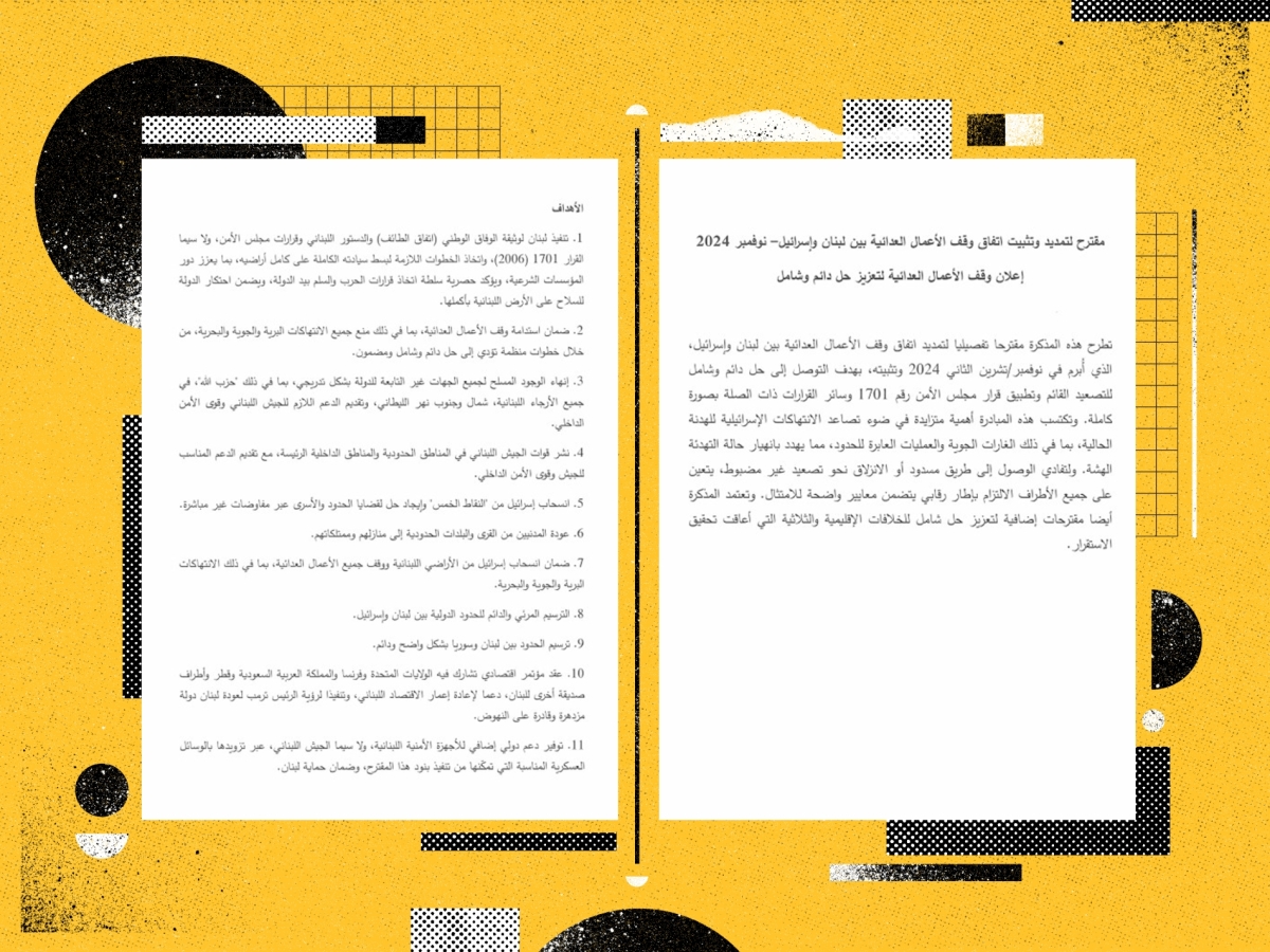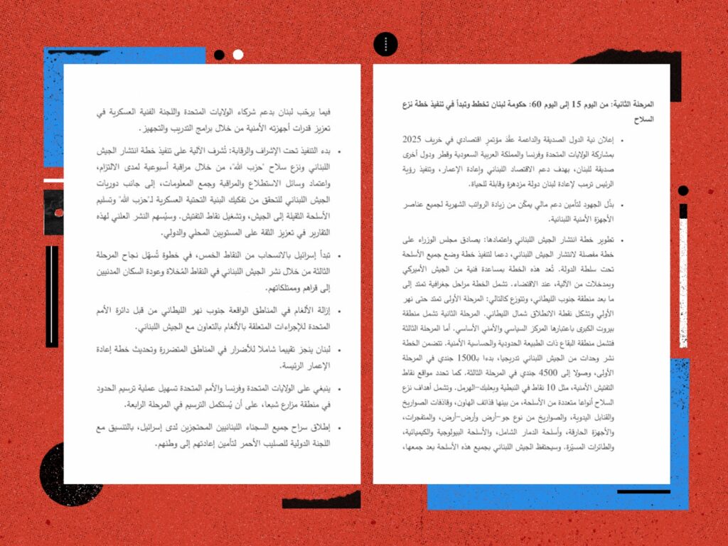 المجلة X FILE “المجلة” تنشر النص الحرفي لـ”الورقة الأميركية” لنزع سلاح “حزب الله” وترسيم حدود لبنان by admin 19 أغسطس، 2025 written by admin 19 أغسطس، 2025 220 أقرت الحكومة اللبنانية جزءا من الورقة يتعلق بـ”الأهداف” بغياب الوزراء الشيعة لندن – “المجلة” تنشر “المجلة” النص الحرفي لورقة توم باراك مبعوث الرئيس الأميركي دونالد ترمب إلى لبنان، التي تتعلق بإنهاء الوجود المسلح بما فيه “حزب الله” في جميع الأراضي اللبنانية ونشر الجيش اللبناني في المناطق الحدودية وترسيم الحدود مع سوريا. وكانت الحكومة اللبنانية أقرت مساء الخميس قسما من الورقة يتعلق بـ”الأهداف”، بغياب الوزراء الشيعة. وتتضمن “حصرية السلاح وبسط سيادة الدولة على كامل أراضيها وضمان استدامة وقف الأعمال العدائية وإنهاء الوجود المسلح لجميع الجهات غير الحكومية، بما فيها “حزب الله”، على كامل الأراضي اللبنانية، وانسحاب إسرائيل من النقاط الخمس، وتسوية القضايا الحدودية وقضايا الأسرى بالطرق الدبلوماسية من خلال مفاوضات غير مباشرة، إضافة إلى عودة المدنيين من القرى والبلدات الحدودية، وترسيم الحدود، وعقد مؤتمر اقتصادي لدعم الاقتصاد اللبناني، وإعادة الإعمار”. وقال دبلوماسيون إن هناك أكثر من نسخة من “الورقة الأميركية” نشرت في وسائل إعلام لبنانية. وتنشر “المجلة” النص الحرفي مترجما من اللغة الإنكليزية: مقترح لتمديد وتثبيت اتفاق وقف الأعمال العدائية بين لبنان وإسرائيل– نوفمبر 2024 إعلان وقف الأعمال العدائية لتعزيز حل دائم وشامل تطرح هذه المذكرة مقترحا تفصيليا لتمديد اتفاق وقف الأعمال العدائية بين لبنان وإسرائيل، الذي أُبرم في نوفمبر/تشرين الثاني 2024 وتثبيته، بهدف التوصل إلى حل دائم وشامل للتصعيد القائم وتطبيق قرار مجلس الأمن رقم 1701 وسائر القرارات ذات الصلة بصورة كاملة. وتكتسب هذه المبادرة أهمية متزايدة في ضوء تصاعد الانتهاكات الإسرائيلية للهدنة الحالية، بما في ذلك الغارات الجوية والعمليات العابرة للحدود، مما يهدد بانهيار حالة التهدئة الهشة. ولتفادي الوصول إلى طريق مسدود أو الانزلاق نحو تصعيد غير مضبوط، يتعين على جميع الأطراف الالتزام بإطار رقابي يتضمن معايير واضحة للامتثال. وتعتمد المذكرة أيضا مقترحات إضافية لتعزيز حل شامل للخلافات الإقليمية والثلاثية التي أعاقت تحقيق الاستقرار. توفير دعم دولي إضافي للأجهزة الأمنية اللبنانية، ولا سيما الجيش اللبناني، عبر تزويدها بالوسائل العسكرية المناسبة التي تمكّنها من تنفيذ بنود هذا المقترح الأهداف تنفيذ لبنان لوثيقة الوفاق الوطني (اتفاق الطائف) والدستور اللبناني وقرارات مجلس الأمن، ولا سيما القرار 1701 (2006)، واتخاذ الخطوات اللازمة لبسط سيادته الكاملة على كامل أراضيه، بما يعزز دور المؤسسات الشرعية، ويؤكد حصرية سلطة اتخاذ قرارات الحرب والسلم بيد الدولة، ويضمن احتكار الدولة للسلاح على الأرض اللبنانية بأكملها. ضمان استدامة وقف الأعمال العدائية، بما في ذلك منع جميع الانتهاكات البرية والجوية والبحرية، من خلال خطوات منظمة تؤدي إلى حل دائم وشامل ومضمون. إنهاء الوجود المسلح لجميع الجهات غير التابعة للدولة بشكل تدريجي، بما في ذلك “حزب الله”، في جميع الأرجاء اللبنانية، شمال وجنوب نهر الليطاني، وتقديم الدعم اللازم للجيش اللبناني وقوى الأمن الداخلي. نشر قوات الجيش اللبناني في المناطق الحدودية والمناطق الداخلية الرئيسة، مع تقديم الدعم المناسب للجيش وقوى الأمن الداخلي. انسحاب إسرائيل من “النقاط الخمس” وإيجاد حل لقضايا الحدود والأسرى عبر مفاوضات غير مباشرة. عودة المدنيين من القرى والبلدات الحدودية إلى منازلهم وممتلكاتهم. ضمان انسحاب إسرائيل من الأراضي اللبنانية ووقف جميع الأعمال العدائية، بما في ذلك الانتهاكات البرية والجوية والبحرية. الترسيم المرئي والدائم للحدود الدولية بين لبنان وإسرائيل. ترسيم الحدود بين لبنان وسوريا بشكل واضح ودائم. عقد مؤتمر اقتصادي تشارك ف