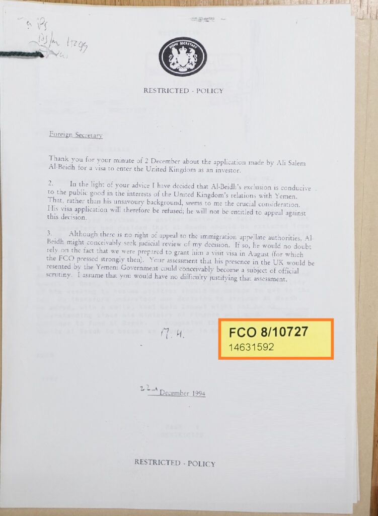 خشيت بريطانيا من التداعيات الدبلوماسية لمنح سالم البيض تأشيرة دخول X FILEعرب وعالم اليمن 1994: مخاوف لندن من استقبال علي سالم البيض by admin 29 أكتوبر، 2025 written by admin 29 أكتوبر، 2025 119 رفضت السلطات البريطانية منح رئيس جمهورية اليمن الديمقراطية تأشيرة دخول بعد حرب 1994 خشيةَ أن يقود المعارضة اليمنية من أراضيها اندبندنت عربية / حامد الكناني كاتب وباحث @kananihamed تكشف سلسلة جديدة من البرقيات الدبلوماسية السرية المفرج عنها حديثاً من الحكومة البريطانية، عن رفض الحكومة البريطانية استضافة رئيس جمهورية اليمن الديمقراطية الشعبية سابقاً علي سالم البيض، الذي تقدم بطلب للحصول على التأشيرة البريطانية بعد أشهر قليلة من انتهاء الحرب الأهلية في اليمن عام 1994، بسبب خشيتها من قيامه بأنشطة سياسية معارضة من أراضيها. ووفق برقيات تتعلق بالسفارة البريطانية لدى سلطنة عمان، ويعود تاريخها لعامي 1994 و1995، فإن الحكومة البريطانية بحثت التداعيات السياسية والدبلوماسية لطلب رئيس جمهورية اليمن الديمقراطية الشعبية سابقاً ونائب الرئيس اليمني السابق وزعيم الجنوب خلال الحرب الأهلية اليمنية، للحصول على تأشيرة دخول إلى المملكة المتحدة في نهاية عام 1994. وكان علي سالم البيض يقيم في سلطنة عمان في ذلك الوقت، بوصفه لاجئاً سياسياً في أعقاب حرب اليمن الأهلية. ووقع البيض اتفاق وحدة مع رئيس الجمهورية العربية اليمنية علي عبدالله صالح، آنذاك، لتأسيس الجمهورية اليمنية في الـ22 من مايو (أيار) 1990، ورفعا معاً علم الوحدة ليقتسما السلطة حتى مايو 1994، عندما اندلعت الحرب التي استمرت حتى يوليو (تموز) من العام نفسه. وتظهر الوثائق المفرج عنها حديثاً، قراراً بالرفض صادر عن وزير الداخلية البريطاني في الـ22 من ديسمبر (كانون الأول) عام 1994، يتعلق بطلب تقدم به سالم البيض للحصول على تأشيرة دخول إلى المملكة المتحدة بصفة مستثمر. وكان القرار نتيجة مشاورات سابقة بين وزارتي الداخلية البريطانية ووزارة الخارجية التي أحالت مذكرة في الثاني من ديسمبر من العام نفسه في شأن الطلب. وبعد دراسة الموضوع ونصائح الخارجية، رأى وزير الداخلية أن منع دخول البيض إلى الأراضي البريطانية يصب في المصلحة العامة، ويحافظ على علاقات المملكة المتحدة مع الجمهورية اليمنية. وعلى رغم إقرار الوزير بأن خلفية البيض السياسية مثيرة للجدل، فإن المبرر الأساس للقرار لم يكن تلك الخلفية، بل الاعتبارات الدبلوماسية المرتبطة بعلاقة لندن بصنعاء. وبناء على ذلك، تقرر رفض طلب التأشيرة، مع التنويه إلى أن البيض لا يملك حق الاستئناف على القرار ضمن القنوات المعتادة لشؤون الهجرة. غير أن الوثيقة أشارت إلى احتمال أن يلجأ البيض، نظرياً، إلى المراجعة القضائية للطعن في القرار، خصوصاً بالنظر إلى أن الحكومة البريطانية كانت قد وافقت في أغسطس (آب) من العام نفسه على منحه تأشيرة زيارة قصيرة، بعد ضغوط من وزارة الخارجية. وبهذا القرار، وضعت الحكومة البريطانية حداً لمحاولة علي سالم البيض دخول المملكة المتحدة في مرحلة كانت تشهد العلاقات اليمنية- البريطانية حساسية دبلوماسية بالغة عقب توحيد اليمن والحرب الأهلية التي أعقبته. وفي الـ13 من يناير (كانون الثاني)، أصدر وزير الخارجية البريطاني برقية سرية موجهة إلى السفارة البريطانية لدى صنعاء، تحت رقم 12، مع نسخة إلى سفارة المملكة المتحدة لدى مسقط، وأخرى معلوماتية إلى الرياض. حملت البرقية عنواناً مقتضباً هو “البيض”. وأوضحت البرقية أن وزارة الداخلية البريطانية قامت في ذلك اليوم بإبلاغ محامي البيض رسمياً بقرار استبعاده من دخول المملكة المتحدة، وذلك خلافاً للنصيحة السابقة الواردة في الفقرة الرابعة من تقرير”TUR” لعام 1994، والتي كانت قد أوصت على ما يبدو بموقف أكثر مرونة تجاه طلبه. المصلحة البريطانية العامة وقد اتفقت وزارة الخارجية مع وزارة الداخلية على خط صحافي موحد للتعامل مع الأسئلة الإعلامية المحتملة حول القرار. ونص هذا الخط على أن وزير الداخلية قرر استبع
