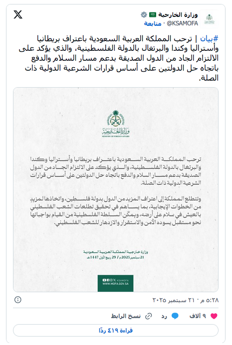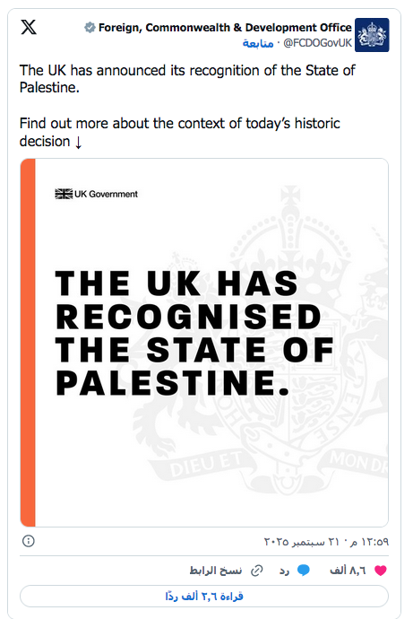 بريطانيا تدرج إسم دولة "فلسطين" على خرائطها رسمياً إسرائيل تعيد فتح جسر الملك حسين... والرئيس الفرنسي يشترط الإفراج عن الرهائن في غزة لإقامة سفارة لدى فلسطين وكالات الاثنين 22 سبتمبر 2025 12:09 الخريطة التي نشرتها الخارجية البريطانية على موقع الحكومة وتظهر اسم فلسطين على أجزاء من الضفة وقطاع غزة (موقع الحكومة البريطانية) ملخص لم تعلق الولايات المتحدة، أوثق حلفاء إسرائيل، حتى الآن على قرار دول من حلفائها الاعتراف بدولة فلسطينية، لكن الرئيس دونالد ترمب أوضح في السابق أنه يعارض مثل هذه الخطوة. أدرجت بريطانيا اليوم الإثنين للمرة الأولى اسم "دولة فلسطين" على خرائطها رسمياً، بينما رحبت وزارة الخارجية السعودية باعتراف بريطانيا وأستراليا وكندا والبرتغال بدولة فلسطين عشية انطلاق أعمال مؤتمر تحالف حل الدولتين في نيويورك. في الموازاة قال متحدث باسم السلطة الإسرائيلية التي تدير الحدود البرية اليوم الاثنين إن جسر الملك حسين، المعبر الوحيد بين الضفة الغربية والأردن، أعيد فتحه. وكانت إسرائيل قد أغلقت المعبر رسمياً في 19 سبتمبر (أيلول) الحالي غداة إطلاق سائق شاحنة أردني النار هناك ما أسفر عن مقتل جنديين إسرائيليين. والمعبر الحدودي هو الطريق الرئيس لنقل البضائع التجارية بين الأردن والضفة الغربية. ترحيب سعودي من جهتها وصفت الخارجية السعودية الاعتراف بأنه "يؤكد الالتزام الجاد من الدول الصديقة دعم مسار السلام والدفع باتجاه حل الدولتين على أساس قرارات الشرعية الدولية ذات الصلة". وأضافت في بيان "تتطلع المملكة إلى اعتراف المزيد من الدول بدولة فلسطين، واتخاذها لمزيد من الخطوات الإيجابية، بما يحقق تطلعات الشعب الفلسطيني بالعيش في سلام على أرضه، وبمكِّن السلطة الفلسطينية من القيام بواجباتها نحو مستقبل يسوده الأمن والاستقرار والازدهار للشعب الفلسطيني". وأمس الأحد اعترفت بريطانيا وكندا وأستراليا والبرتغال بالدولة الفلسطينية في خطوة جاءت تعبيراً عن الإحباط من تداعيات حرب غزة وتهدف إلى تعزيز حل الدولتين، لكنها أثارت غضب إسرائيل. وانضمت الدول الأربع في قرارها إلى أكثر من 140 دولة أخرى تدعم أيضاً تطلع الفلسطينيين إلى إقامة وطن مستقل عن الأراضي التي تحتلها إسرائيل. والدول الأربع من حلفاء إسرائيل التقليديين. ويحمل قرار بريطانيا ثقلاً رمزياً بالنظر للدور الرئيس الذي اضطلعت به لندن في قيام إسرائيل في أعقاب الحرب العالمية الثانية. وقال رئيس الوزراء البريطاني كير ستارمر على منصة "إكس"، "تعلن المملكة المتحدة رسمياً اعترافها بدولة فلسطينية من أجل إحياء أمل السلام للفلسطينيين والإسرائيليين وتحقيق حل الدولتين". وأضاف ستارمر "زادت حدة الأزمة الإنسانية التي هي من صنع الإنسان في غزة. فقصف الحكومة الإسرائيلية المستمر والمتزايد على غزة بلا هوادة والهجوم في الأسابيع القليلة الماضية والتجويع والدمار بات غير محتمل على الإطلاق". ومن المتوقع أن تحذو دول أخرى، منها فرنسا حذو بريطانيا هذا الأسبوع في الجمعية العامة للأمم المتحدة في نيويورك. العلم الفلسطيني إلى جوار علم الأمم المتحدة في نيويورك (رويترز) واشنطن تصف الاعتراف بأنه "استعراضي" وصفت الولايات المتحدة الأحد اعتراف عدد من حلفائها الرئيسين، بما في ذلك بريطانيا وأستراليا وكندا، بدولة فلسطينية بأنه "استعراضي". وقال أحد المتحدثين باسم الخارجية الأميركية مشترطاً عدم كشف هويته "لا يزال تركيزنا منصباً على الدبلوماسية الجادة وليس اللفتات الاستعراضية". وأضاف، وفق وكالة الصحافة الفرنسية، "أولوياتنا واضحة: إطلاق سراح الرهائن وأمن إسرائيل والسلام والازدهار للمنطقة بأسرها الذي لا يمكن أن يتحقق إلا إذا كانت خالية من (حماس)". الفلسطينيون يرحبون بالاعتراف قال الفلسطيني شرف الطردة المقيم في مدينة الخليل بالضفة الغربية المحتلة "إنه واجب إنساني ووازع أخلاقي لدى كل إنسان شريف وحر في هذا العالم أن ينصف الشعب الفلسطيني في المحنة التي يمر بها الآن، وأعتقد