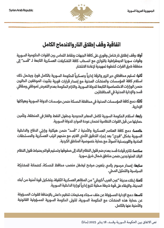 الشرع عقب توقيع الاتفاق مع "قسد"، 18 يناير 2026 (العربي الجديد) عرب وعالم بنود اتفاق وقف إطلاق النار بين الحكومة السورية و”قسد” by admin 18 January، 2026 written by admin 18 January، 2026 97 الشرع: الاتفاق الجديد هو من روح اتفاق 10 مارس العربي الجديد / نور ملحم توصلت الحكومة السورية، مساء الأحد، إلى اتفاق مع “قوات سوريا الديمقراطية” (قسد)، ينص على وقف إطلاق نار شامل وفوري على كل الجبهات ونقاط التماس بالتوازي مع انسحاب كل التشكيلات العسكرية التابعة لـ”قسد” إلى منطقة شرق الفرات كخطوة تمهيدية لإعادة الانتشار. وجاء في بيان تلته الرئاسة في قصر الشعب اليوم بدمشق، وحضره “العربي الجديد”، أنه جرى التوقيع على اتفاق جديد مع “قوات سوريا الديمقراطية” بحضور المبعوث الأميركي براك، ووقعّه أيضا مظلوم عبدي وإن لم يحضر الاجتماع. ويتضمن الاتفاق تسليم “قسد” محافظتي دير الزور والرقة إدارياً وعسكرياً للحكومة السورية بالكامل فوراً على أن “يشمل ذلك استلام كل المؤسسات والمنشآت المدنية مع إصدار قرارات فورية بتثبيت الموظفين الحاليين ضمن الوزارات الاختصاصية التابعة للدولة السورية، والتزام الحكومة بعدم التعرض لموظفي ومقاتلي “قسد” والإدارة المدنية في المحافظتين”. وعلاقة بالتعيينات، يسمح الاتفاق بـ”اعتماد قائمة قيادات مرشحة مقدمة من قيادة “قسد” لشغل مناصب عسكرية وأمنية ومدنية عليا في هيكلية الدولة المركزية لضمان الشراكة الوطنية”. وفي حين سيتم في محافظة الحسكة “دمج كل المؤسسات المدنية ضمن مؤسسات الدولة السورية وهياكلها الإدارية” مع تعيين محافظ للحسكة بمرسوم رئاسي كضمانة للمشاركة السياسية والتمثيل المحلي، جرى الاتفاق على أن تخلو مدينة عين العرب كوباني من “المظاهر العسكرية الثقيلة، إضافة إلى تشكيل قوة أمنية من أبناء المدينة، والإبقاء على قوة شرطة محلية تتبع إدارياً لوزارة الداخلية السورية”. كما اتُّفق على “العمل للوصول لتفاهمات تخص العودة الآمنة والكريمة لأهالي منطقة عفرين والشيخ مقصود إلى مناطقهم”. كذلك ستتسلم الحكومة السورية، بموجب الاتفاق “المعابر الحدودية وحقول النفط والغاز في المنطقة، وتأمين حمايتها من قبل القوات النظامية لضمان عودة الموارد للدولة”. في الشق العسكري، ينص الاتفاق على “دمج كل العناصر العسكرية والأمنية لـ”قسد” ضمن هيكلية وزارتي الدفاع والداخلية السورية بشكل فردي بعد إجراء التدقيق الأمني اللازم، مع منحهم الرتب العسكرية والمستحقات المادية واللوجستية أصولاً، مع حماية خصوصية المناطق الكردية مع التزام “قيادة قسد بعدم ضم فلول النظام البائد إلى صفوفها وتسليم قوائم بضباط فلول النظام البائد المتواجدين ضمن مناطق شمال شرق سوري”، بحسب مضمون الاتفاق، الذي التزمت بموجبه “قسد” بإخراج كل قيادات وعناصر حزب العمال الكردستاني (PKK) غير السوريين خارج البلاد لضمان السيادة واستقرار الجوار. ويقضي الاتفاق كذلك بدمج الإدارة المسؤولة عن ملف سجناء ومخيمات تنظيم “داعش”، بالإضافة للقوات المسؤولة عن حماية هذه المنشآت مع الحكومة السورية، لتتولى الحكومة السورية المسؤولية القانونية والأمنية عنها بالكامل. وفي المقابل، تلتزم دمشق بـ”مواصلة مكافحة الإرهاب (داعش) كعضو فاعل في التحالف الدولي مع التنسيق المشترك مع الولايات المتحدة في هذا الإطار لضمان أمن واستقرار المنطقة”. كما يرحب الاتفاق بـ”المرسوم الرئاسي رقم 13 لعام 2026 الذي ينص على الاعتراف بالحقوق الثقافية واللغوية الكردية، وعلى معالجة القضايا الحقوقية والمدنية لمكتومي القيد واستعادة حقوق الملكية المتراكمة من العقود السابقة”. وخلال توقيعه على الاتفاق، قال الرئيس السوري، أحمد الشرع، في دمشق، “ارتأينا أن نوقع اتفاقا مع تنظيم “قسد” من خلال الاتصالات لتهدئة التوترات الآن وسنتابع تفاصيل باقي بنود الاتفاق غدا (الاثنين)” عندما يصل قائد “قسد”، مظلوم عبدي إلى دمشق. وأضاف: “الاتفاق الذي توصلنا إليه اليوم مع قسد هو من روح اتفاق 10