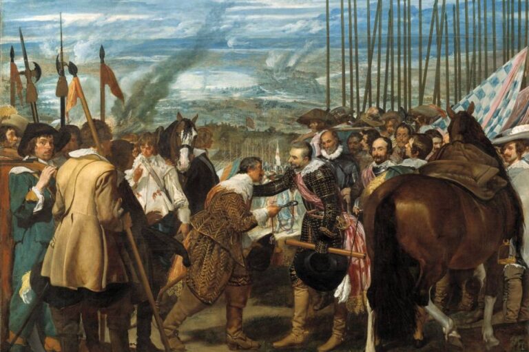 لوحة _استسلام بريدا_ لبيلاسكويث (1634 – 1635) (موسوعة الفن الكلاسيكي) ثقافة و فنون بيلاسكويث رسم لوحته الأكثر إنسانية بعد 10 أعوام من أحداثها by admin 24 أبريل، 2025 written by admin 24 أبريل، 2025 138 “استسلام بريدا” المتأرجحة بين حضور ختام المعركة أو استلهام مسرحية لكالديرون اندبندنت عربية / إبراهيم العريس باحث وكاتب إذا كان مؤرخو الفن وبخاصة منهم متابعو أعمال الرسام الإسباني الكبير دييغو بيلاسكويث (1599 – 1660)، قد عَدوا دائماً لوحته الضخمة “استسلام بريدا” والمعلقة في متحف برادو المدريدي، واحدة من أعظم أعماله، فإن المفكرين والفنانين المهتمين بالتاريخ الأخلاقي والإنساني للفن قد نظروا إلى هذه اللوحة نفسها باعتبارها اللوحة الأكثر إنسانية في تاريخ الفن، وليس فحسب، بالطبع، لكونها تصور لحظة انتهاء واحدة من أقسى الحروب الدينية التي عرفتها أوروبا في تاريخها، وبداية زمن من السلم أسعد الأوروبيين جميعاً، بل لأن المشهد الذي تصوره اللوحة جاء متسماً، من خلال سيماء وجوه شخصياته الرئيسة، بقدر هائل من التسامح والود كما سنرى بعد سطور. أما هنا فلا بأس من أن نتوقف بعض الشيء عند سؤال كثيراً ما حير المؤرخين بصدد هذه اللوحة. ويتعلق السؤال تحديداً بالطول الاستثنائي للفترة الزمنية الفاصلة بين الحدث الذي تصوره اللوحة، وهو 10 أعوام كاملة، واللحظة التي اشتغل فيها بيلاسكويث على لوحته وأنجزها ليعيد من خلالها استذكار تلك اللحظة المميزة في التاريخ الأوروبي، ولكن أي استذكار!!. فلحظة استسلام بريدا أتت تحديداً عند بداية يونيو (حزيران) من عام 1625 بمعنى أن العالم يجدر به أن يحتفل بالذكرى المئوية الرابعة لذلك الحدث الاستثنائي خلال الأسابيع المقبلة، وليس فقط لأهمية الحدث التاريخية، بل لأهميته الأخلاقية الإنسانية، كما تتجلى في هذه اللوحة في الأقل. وهذا بالنسبة إلى الحدث، أما لوحته التي احتفظ بها الفن بوصفها تسجيلاً مدهشاً لما حدث يوم الثاني من يونيو (حزيران)، فقد أنجزها الرسام في عام 1635. المسرح كان هناك غير أن الأهم من ذلك إنما يكمن في مكان آخر. مكان يفيدنا بأن بيلاسكويث الذي قد توحي اللوحة، بقوة تعبيريتها وواقعية شخصياتها ناهيك بالدروس، الرسائل، التي يمكن بالضرورة استخلاصها منها، أن الرسام كان حاضراً كشاهد عيان في تلك اللحظة التاريخية، لكن بيلاسكويث لم يكن حاضراً حتى وإن كان عدد من شخوص اللوحة الثانويين ينظرون في اتجاه ما يفترض أنه المكان الذي منه ترصد عين الرسام ما يحدث وتسجله لتطبعه ولو لاحقاً على مسطح “شاشة” كبيرة لا يقل عرضها عن 370 سم وارتفاعها عن 307 سم. والحال أن استخدامنا كلمة “شاشة” هنا ليس افتئاتاً بل مقاربة لفن آخر ولو بالمواربة كما سنذكر هنا بصورة مباشرة. وهذا الأمر يضعنا على أية حال على تماس مباشر مع الإجابة التي تفسر ذلك الفارق الزمني بين الحدث والتعبير الفني عنه مع المرور على كون الفنان نفسه كان بالضرورة غائباً عن لحظة الاستسلام ومكانه. ففي نهاية الأمر ما يصوره بيلاسكويث هنا إنما هو مشهد مسرحي وبالمعنيين، الفني من جهة والحقيقي من جهة ثانية. والمشهد الذي يصوره الفنان هنا لم يصله من طريق كتب التاريخ أو من طريق شهود عيان أو أي شيء من هذا القبيل، بل من طريق مشهد مسرحي. نعم ما رسمه بيلاسكويث هنا ليس في حقيقة أمره سوى مشهد من مسرحية قدمت على الخشبة الإسبانية في مدريد تحديداً بعنوان “كيف تم استسلام بريدا” وكانت المسرحية من تأليف كالديرون ديلا باركا الذي عد من أخصب المؤلفين المسرحيين في تاريخ هذا الفن وليست مسرحية “استسلام بريدا” سوى واحدة من نحو 400 مسرحية اشتهرت له في حياته ولا تزال كذلك حتى الآن. دييغو بيلاسكويث (1599 – 1660) موقف فنان (الموسوعة البريطانية) بيلاسكويث بين الجمهور كالديرون من ناحيته لم يحتج إلى أكثر من أربعة أشهر لكتابة مسرحيته فهو أنجزها وقام بتحضيراتها التقنية وقدمها على الخشبة المدريدية بدءاً من أواسط نوفمبر (تشرين الثاني) من عام الاستسلام نفسه. ولم يكن الأمر معجزة بالنسبة إليه فهو 