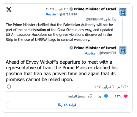 شدد نتنياهو أمام ويتكوف على أن أي تحرك سياسي يجب أن يستند إلى آليات رقابة وتنفيذ صارمة، لا إلى تصريحات نوايا (مكتب المبعوث الأميركي على إكس) عرب وعالم خمس مطالب إسرائيلية لاتفاق مع إيران فما هي؟ by admin 5 فبراير، 2026 written by admin 5 فبراير، 2026 75 يكمن قلق تل أبيب الذي انعكس في المحادثات مع ويتكوف من عدم إصرار الأميركيين على مبدأ “صفر تخصيب” اندبندنت عربية / أمال شحادة شكلت حادثة إسقاط الجيش الأميركي مسيرة إيرانية في بحر العرب مع اقتراب زوارق إيرانية من ناقلة نفط أميركية في مضيق هرمز، ذريعة لجهات إسرائيلية بإبقاء الهجوم على إيران في أولوية مطالبها من واشنطن، بينما أدرجت تل أبيب مطلب حرية العمل العسكري في إيران ضمن مبادئ عدة طالبت بعدم التنازل عنها في المفاوضات المتوقعة الجمعة المقبل. مطلب حرية عمل سلاح الجو الإسرائيلي كان أحد المطالب الإسرائيلية الذي أثار نقاشاً وخلافات مع المبعوث الأميركي الخاص في الشرق الأوسط، ستيف ويتكوف، الذي اجتمع مع رئيس الحكومة الإسرائيلية بنيامين نتنياهو وقادة الأجهزة الأمنية والعسكرية، عشية بدء جلسة محادثات الاتفاق مع إيران. نتنياهو شدد أمام ويتكوف على أن أي تحرك سياسي يجب أن يستند إلى آليات رقابة وتنفيذ صارمة، لا إلى تصريحات نوايا، مضيفاً أن “إيران أثبتت مراراً وتكراراً أنه لا يمكن الوثوق بتعهداتها”. ولم يخف نتنياهو والقيادة الإسرائيلية خلال لقاء ويتكوف التخوف من احتمال التوصل إلى اتفاق محدود يركز على الجانب النووي فقط، ويساعد إيران في التسهيلات الاقتصادية والشرعية السياسية من دون تقليص التهديد الاستراتيجي لإسرائيل. وكرروا أمام ويتكوف ما سبق وقاله الأمنيون والعسكريون في اللقاءات مع نظرائهم في واشنطن أخيراً، أن إسرائيل لن تقبل بأي وضع تستمر فيه إيران بحيازة الصواريخ الباليستية وتعزيز ترسانتها الصاروخية، وحذروا من تسوية تتجاهل عنصرَين مركزيَين: استمرار تطوير منظومة الصواريخ الإيرانية، ونشاط إيران الإقليمي عبر أذرع مسلحة في لبنان وسوريا والعراق واليمن. 5 مبادئ وحرية العمل أهمها يكمن القلق الإسرائيلي، الذي انعكس في المحادثات مع ويتكوف، من عدم إصرار الأميركيين على مبدأ “صفر تخصيب”، وحتى عدم إخراج 450 كيلوغراماً من اليورانيوم المخصب بنسبة 60 في المئة والمدفون تحت الأنقاض. وبحسب مسؤول مطلع على سير المحادثات فإن واشنطن التي تفهمت مطالب إسرائيل في الملف النووي قد تتجاهل من أجل تحقيق الاتفاق، المطالب المتعلقة بالصواريخ الباليستية وما سماها “انتشار أذرع إيران في الشرق الأوسط”، وهذه بحسبه وضعية تشكل معضلة حقيقية لتل أبيب. “المسار الدبلوماسي لا يزال قيد فترة التحقق من مدى نجاحه”، وفق المسؤول الإسرائيلي، ويضيف أنه بحسب ما فُهم من شخصيات أميركية فإن المسار التفاوضي وإن استمر لجلسات، لكنه غير مضمون النجاح، وهو ما يجعل الأميركيين يختارون في نهاية المطاف العمل العسكري”. أمن شامل للمنطقة أو هجوم غير مسبوق وواصل ويتكوف في تل أبيب مناقشة مختلف النقاط التي لم يتم الاتفاق عليها خلال لقاءات الإسرائيليين في واشنطن، وآخرهم رئيس الأركان إيال زامير، وقد عرض المسؤولون الإسرائيليون خمسة مبادئ أساسية لأي اتفاق مع إيران، وهي مبادئ استبعد أمنيون تنفيذها لما تشكله من عقبات أمام التقدم في المحادثات. المبدأ الأول الذي يعده الإسرائيليون أساسياً في الاتفاق هو تفريغ المخزون الإيراني من اليورانيوم عالي التخصيب والذي يصل حجمه إلى 450 كيلوغراماً إلى دولة أخرى. وتوقع مسؤول مطلع على الملف الإيراني، رفض كشف اسمه، أن تكون روسيا هي الدولة التي سيُنقل إليها اليورانيوم. المبدأ الثاني هو ضمان وقف إيران بشكل كامل ومطلق لعملية تخصيب اليورانيوم داخل أراضيها. وينص المبدأ الثالث على فرض قيود صارمة على إنتاج الصواريخ الباليستية، من حيث المدى والكمية. ويؤكد المبدأ الرابع على ضرورة وقف تمويل ودعم الأذرع الإيرانية في المنطقة، مثل “حزب الله” والحوثيين. أما المبدأ 