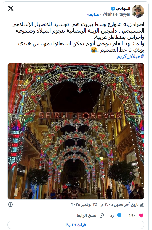 صورة لزينة الميلاد في وسط العاصمة بيروت (مواقع التواصل الاجتماعي) منوعات زينة بيروت تقسم اللبنانيين… الأضواء حمالة أوجه ومعان by admin 27 November، 2025 written by admin 27 November، 2025 66 تحولت إلى محور نقاش واسع على منصات التواصل بعد تشبيهها بزينة شهر رمضان اندبندنت عربية / فدى مكداشي صحافية @FidaMikdashi لم يكن الجدال الذي اجتاح منصة “إكس” حول زينة عيد الميلاد في وسط بيروت مجرد نقاش جمالي مألوف في موسم الأعياد، بل تحول إلى ساحة تظهر كيف يمكن لعمل بصري واحد أن يُقرأ بطرق متناقضة في مدينة شديدة التنوع الثقافي مثل العاصمة اللبنانية. فمع إضاءة الأقواس الضوئية الجديدة في قلب الوسط التجاري سارع كثر إلى القول إن التصميم يوحي بزينة مرتبطة بشهر رمضان بسبب الألوان الحادة والزخارف الهندسية التي تشبه ما يستخدم عادة في الاحتفالات الشعبية في العالم العربي. في المقابل رد آخرون بأن هذا النوع من التركيبات الضوئية شائع في مدن أوروبية عديدة ويستخدم في المهرجانات والاحتفالات الشتوية، ولا يحمل أي دلالة دينية مباشرة. وبين هذين الموقفين ظهرت أصوات تنتقد بلدية بيروت معتبرة أن الالتباس البصري ناتج عن غياب رؤية واضحة لهوية الزينة، فيما لجأ البعض إلى السخرية، وهي ردة فعل لبنانية مألوفة في مواجهة أي مشهد عام مثير للنقاش. ومع اتساع السجال، بدا كأن السؤال لم يعد يتعلق بزينة الميلاد نفسها، بل بقدرة مدينة متعددة الانتماءات مثل بيروت على استقبال فن معاصر بلغة قد تفهم بطريقة مختلفة من عين إلى أخرى. خلف الكواليس في السياق يوضح مصدر مطلع في بلدية بيروت لـ”اندبندنت عربية” أن “زينة العاصمة في وسط بيروت التجاري هذا العام تأتي ضمن شراكة بين شركة ‘سوليدير’ (الشركة اللبنانية لتطوير وإعادة إعمار وسط بيروت) وجهة خاصة تولت التصميم والتنفيذ”، مشيراً إلى أن “العام الماضي شهد أيضاً إضاءة مماثلة في المنطقة، لكن الزينة الحالية جرى تطويرها وتوسيع نطاقها بما يتماشى مع الرؤية الجديدة لإحياء الوسط التجاري وجذب الزوار خلال موسم الأعياد“. ويوضح أن الحديث عن أن الزينة تحمل طابعا إسلامياً هو “انطباع غير دقيق”، إذ إن المصمم الذي تولى المشروع “يحمل رؤية غربية بحتة مستوحاة من أساليب الإضاءة الأوروبية”، وأن اختيار الألوان والأشكال جاء “ضمن مقاربة فنية تجارية تهدف إلى خلق جو احتفالي عام، لا يحمل أي رمزية دينية مباشرة”. كيف يغير الضوء معناه بين ثقافتين؟ في مدينة اعتادت أن ترى بأكثر من عين، لا يمر الضوء مروراً عادياً، ما يلمع في شارع قد يتبدى رمزاً في شارع آخر، وما يقرأ احتفالاً في ثقافة ما، قد يفهم استعارة شرقية في ثقافة ثانية. هكذا تبدو بيروت بطرقها المزدحمة وروحها الهجينة ساحة اختبار دائم للعناصر البصرية التي تعبرها. فأي تصميم ضوئي فيها لا يقاس فقط بحجمه أو ألوانه، بل بقدرته على التنقل بين تراثين، وبمرونته أمام أعين ترى العالم من زوايا متباينة. صورة انتشرت قيل إنها تظهر زينة مماثلة في لندن (مواقع التواصل الاجتماعي) في هذا الإطار يوضح الفنان البصري عبدالرحمن عيران أن “التصميم الضوئي المثبت في الشارع يقوم على إعادة قراءة لتقليد إيطالي معروف باسم Luminarie، يعود تاريخياً إلى جنوب إيطاليا ويستخدم في الاحتفالات الدينية والمناسبات الشعبية”، مؤكداً أن “العمل يعتمد صياغة متوسطية يتم تقديمها ضمن سياق بيروتي – عربي معاصر”. ويشرح أن “عناصر تصميم الـLuminarie لا تستقبل بصرياً بالطريقة نفسها في الثقافات المختلفة، بل تحمل دلالات متحولة تبعاً لخلفية المتلقي”. فبحسب عيران، “تقرأ هذه الزخارف الضوئية في العين الغربية كعناصر احتفالية وساحرة تذكر بطابع الكاتدرائيات والمواسم الدينية في جنوب إيطاليا، بينما تقرأ في العين العربية على أنها رمضانية وشرقية وأقرب إلى الأرابيسك (وهو فن زخرفي هندسي يرتكز على التكرار والتشابك والانسياب، ويعد من أهم بصمات الفن العربي – الإسلامي)”. ويلفت عيران إلى أن “النمط البصري نفسه قادر على إثارة مشاعر متباينة 