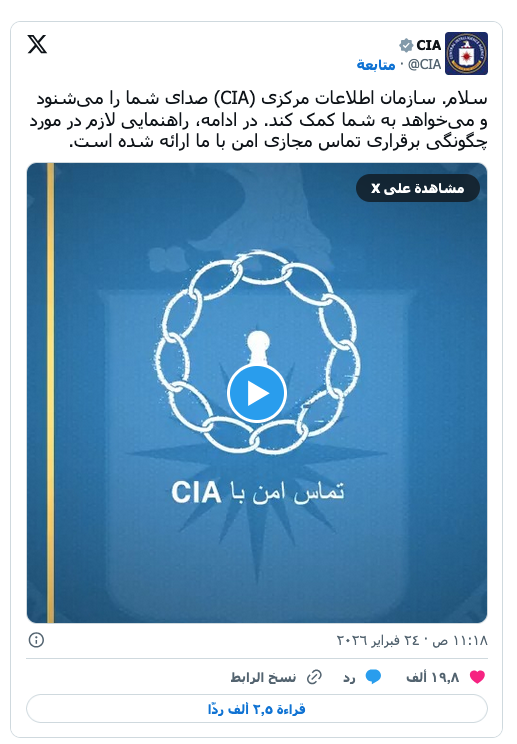 مقر وكالة الاستخبارات المركزية الأميركية "سي آي أيه" (رويترز) عرب وعالم “سي آي أيه” توجه رسالة إلى الإيرانيين لاتصال آمن معها by admin 24 فبراير، 2026 written by admin 24 فبراير، 2026 60 نشرت مقطعاً مصوراً باللغة الفارسية عبر منصة “إكس” يعرض مساعدتهم اندبندنت عربية وجّهت “وكالة الاستخبارات المركزية الأميركية” (سي آي أيه) رسالة إلى المواطنين الإيرانيين اليوم الثلاثاء باللغة الفارسية، تنصحهم بكيفية التواصل معها بطريقة آمنة، قبل جولة من المفاوضات بين واشنطن وطهران فيما يفكر الرئيس دونالد ترمب في توجيه ضربة عسكرية لإيران. ونشر حساب الوكالة عبر منصة “إكس” رسالة مصحوبة بمقطع مصور يعرض مساعدة على الإيرانيين الراغبين في التواصل معها بطريقة آمنة. وتقول الرسالة، “مرحباً. وكالة الاستخبارات المركزية (CIA) تستمع إليكم وترغب في مساعدتكم. إليكم كيفية إجراء مكالمة افتراضية آمنة معنا”. كانت كارولاين ليفيت، المتحدثة باسم الرئيس الأميركي دونالد ترمب، قالت الثلاثاء إن الخيار الأول لترمب في التعامل مع إيران هو دائماً الدبلوماسية، لكنه على استعداد لاستخدام القوة الفتاكة إذا لزم الأمر. جاء ذلك بينما يستعد وزير الخارجية الأميركي ماركو روبيو لإطلاع كبار قادة الكونغرس على الوضع في ما يتعلق بإيران في وقت لاحق اليوم. وقالت ليفيت للصحافيين في “البيت الأبيض”، “الخيار الأول للرئيس ترمب هو دائماً الدبلوماسية. لكن كما أبدى فهو مستعد لاستخدام القوة الفتاكة لجيش الولايات المتحدة إذا لزم الأمر”. وأضافت “الرئيس هو دائماً صاحب القرار النهائي”. ونشرت الولايات المتحدة قوة بحرية ضخمة بالقرب من سواحل إيران تمهيداً لشن ضربات محتملة عليها. وقال ترمب في 19 فبراير (شباط) إنه يمنح طهران ما بين 10 و15 يوماً لإبرام اتفاق. وقد يتطرق ترمب إلى تهديداته بقصف إيران بسبب برنامجها النووي عندما يدلي بخطاب حال الاتحاد مساء اليوم. وبدأ الحرس الثوري الإيراني مناورات عسكرية على طول الساحل الجنوبي لإيران قبالة الخليج، بحسب ما أفاد التلفزيون الرسمي، في وقت تكثّف الولايات المتحدة ضغوطها على طهران. وأوضح التلفزيون الإيراني أن هذه المناورات التي “تركّز على السواحل الجنوبية والجزر” المجاورة، تشمل صواريخ ومدفعية وطائرات مسيّرة وقوات خاصة وآليات مدرعة، في حين نشرت الولايات المتحدة في المنطقة حشداً بحرياً وجوياً كبيراً، مع إبقاء احتمال توجيه ضربات ضد إيران قائماً. ووصلت حاملة الطائرات الأميركية الأكبر في العالم “جيرالد آر. فورد” إلى القاعدة البحرية الأميركية في خليج سودا بجزيرة كريت اليونانية، في طريقها للانضمام إلى حشد عسكري واسع للولايات المتحدة في الشرق الأوسط. المزيد عن: إيران أميركا سي آي أيه وكالة الاستخبارات الأميركية 0 comment 0 FacebookTwitterPinterestEmail admin previous post الفضائيون… أحجية أميركية في “المنطقة 51” next post إجلاء أميركي من بيروت… هل اقتربت ساعة المواجهة؟ You may also like ثري إيراني متهم ببناء إمبراطورية عقارية في لندن... 6 مارس، 2026 الأكراد… شتات الأرض وتيه الحقوق 6 مارس، 2026 الرهان على الأكراد الإيرانيين مغر لأميركا وإسرائيل 6 مارس، 2026 خاص: لهذا السبب فرض لبنان تأشيرة على دخول... 6 مارس، 2026 تشرذم المعارضة يصعب تغيير الحكم في إيران 6 مارس، 2026 القصة الكاملة لغرق السفينة الإيرانية أمام سواحل سريلانكا 6 مارس، 2026 كيف تحولت “مدن الصواريخ” إلى عبء عسكري على... 5 مارس، 2026 ترامب: ندعم شن الأكراد هجوما على إيران 5 مارس، 2026 ليبيا.. كشف خيوط اغتيال سيف الإسلام القذافي 5 مارس، 2026 تقرير: طهران تلوّح بتفاوض استخباراتي لإنهاء الحرب 5 مارس، 2026