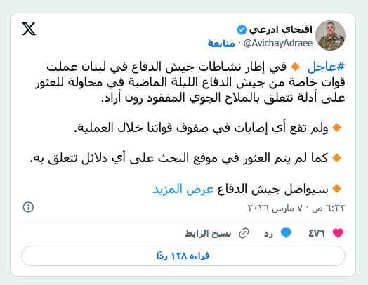 علم لـ«حزب الله» في أحد المواقع التي استهدفها القصف الإسرائيلي في بلدة النبي شيت في بعلبك (أ.ف.ب) عرب وعالم عملية إنزال «النبي شيت» تفتح فرضيات استخبارية وعسكرية by admin 8 مارس، 2026 written by admin 8 مارس، 2026 73 خبراء: فقدان عنصر المفاجأة يجعل تكرارها أكثر صعوبة الشرقالاوسط / بيروت: صبحي أمهز تحوّلت بلدة النبي شيت في بعلبك إلى محور تساؤلات أمنية بعد عملية إنزال إسرائيلية نادرة في العمق اللبناني، رافقها قصف جوي عنيف، واشتباكات محلية، في حادثة أعادت إلى الواجهة طبيعة العمليات الخاصة التي قد تلجأ إليها إسرائيل عندما يتعلق الأمر بأهداف استخبارية حساسة، أو مواقع يصعب التعامل معها عبر الضربات الجوية التقليدية. فرضيات متعددة وبينما ربط بيان الناطق باسم الجيش الإسرائيلي أفيخاي أدرعي العملية بملف الطيار الإسرائيلي المفقود رون آراد، تشير قراءات عسكرية أخرى إلى احتمال ارتباطها بأهداف استخبارية أوسع، سواء لجمع معلومات ميدانية، أو للوصول إلى مواقع أو تجهيزات يصعب استهدافها بالقصف الجوي فقط. الحفرة التي حفرها الجيش الإسرائيلي في مدافن آل شكر في بلدة النبي شيت بحثاً عن الطيار المفقود رون آراد (أ.ب) وتزداد هذه الفرضيات في ضوء ما تحدثت عنه أوساط محلية في المنطقة من أن الحادثة لم تكن الأولى من نوعها، إذ تشير هذه الأوساط إلى أنه سبق قبل فترة أن جرت محاولة إنزال في جرد من جرود المنطقة، لكنها فشلت. وتقول إن تلك المحاولة وقعت قبل حادثة استدراج الضابط المتقاعد في الأمن العام أحمد شكر، ما يعزز لدى بعض المتابعين فرضية أن المنطقة كانت موضع اهتمام استخباري إسرائيلي منذ مدة. وأعلن الجيش الإسرائيلي السبت أنّ قوات خاصة نفّذت عملية في لبنان كان هدفها العثور على رفات الطيار رون آراد المفقود منذ العام 1986، وانتهت دون العثور على «أي دلائل» تعود له. في المقابل، أكد كل من «حزب الله» والجيش اللبناني أن العملية شملت إنزال قوة مشاة، وتسللها إلى بلدة النبي شيت قرب الحدود السورية، وتخللتها غارات جوية أسفرت عن مقتل 41 شخصاً على الأقل، بحسب وزارة الصحة. وفي بيانه قال الجيش الإسرائيلي: «عملت قوات خاصة… الليلة الماضية في محاولة للعثور على أدلة تتعلق بالملاح الجوي المفقود رون آراد»، مشيراً إلى أنه «لم يتم العثور في موقع البحث على أي دلائل تتعلق به». وفقد أثر آراد بعد إسقاط طائرته فوق لبنان في العام 1986، ويرجح أنه مات، غير أن رفاته لم يُعثر عليها أبداً. وأكد بيان الجيش الإسرائيلي عدم وقوع إصابات في صفوف قواته خلال العملية. وأعلن «حزب الله» من جهته أن مقاتليه رصدوا «تسلّل 4 مروحيّات تابعة لجيش العدو الإسرائيلي من الاتجاه السوري»، ثم تطور التسلل إلى اشتباك «بعد انكشاف القوّة المعادية، حيث لجأ العدو إلى تنفيذ أحزمة ناريّة مكثّفة شملت نحو أربعين غارة». وأكد الجيش اللبناني أن إسرائيل قامت بـ«إنزال قوة معادية»، ونعى الحزب ثلاثة من جنوده قتلوا «نتيجة القصف المعادي العنيف الذي رافق» العملية. وأشار إلى أنه تلا القصف «تبادل إطلاق النار بين القوة المعادية وأبناء المنطقة». واستخدم الجيش الإسرائيلي «الطيران الحربي والمروحي لأجل تأمين انسحاب القوة من منطقة الاشتباك»، بحسب بيان «حزب الله» الذي أكد أن مقاتليه أطلقوا صواريخ أثناء عملية الانسحاب. فرضية البحث عن آراد وفي هذا السياق، قال العميد المتقاعد خليل الحلو إن المعطيات المتداولة بشأن عملية الإنزال ترتبط على الأرجح بملف الطيار الإسرائيلي المفقود. أما بشأن تفاصيل عملية الإنزال نفسها، فقال الحلو لـ«الشرق الأوسط»: إنّ «المعلومات المتوافرة تشير إلى أنها حصلت في المنطقة الحدودية بين لبنان وسوريا في محيط معربون – الزبداني، موضحاً أن الروايات تختلف حول عدد الطوافات المشاركة فيها، إذ تحدثت بعض المصادر عن أربع طوافات، فيما يرجّح هو أن العدد كان أقل، ربما كانت طوافة واحدة أو اثنتين». وأشار إلى أن «بعض الروايات تحدثت أيضاً عن استخدام سيارات إسعاف خلال العملية، وهو ما يطرح 