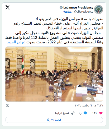 الرئيس جوزيف عون مترئساً جلسة الحكومة التي اتخذ خلالها قرار تعليق العمل بالمادة 112 وأحيل مشروع القانون إلى البرلمان (رئاسة الجمهورية) عرب وعالم لبنان: صلاحيات بري الواسعة تهدد مسار انتخابات المغتربين by admin 9 نوفمبر، 2025 written by admin 9 نوفمبر، 2025 107 بعد إلقاء الحكومة مشروع القانون في مرمى البرلمان الشرق الاوسط / بولا أسطيح عاد ملف انتخاب المغتربين إلى ملعب البرلمان اللبناني بعد إحالة الحكومة الخميس مشروع قانون معجّل مكرر لتعديل المادة المرتبطة بحصر أصواتهم بـ6 مقاعد نيابية ومنحهم مجدداً حق التصويت للنواب الـ128 حسب دوائرهم الانتخابية. ويمهد اعتراض وزراء «الثنائي الشيعي» («أمل» و«حزب الله») على هذا المشروع لدخوله في متاهة اللجان النيابية، خاصة أن المواد الدستورية والنظام الداخلي لمجلس النواب يتركان صلاحيات واسعة لرئيس البرلمان بالتعامل مع مشاريع واقتراحات القوانين، فيمرر ما يراه مناسباً، كما يستطيع أن يترك ما يريد من القوانين معلقاً. ويعارض «حزب الله» و«أمل» ومعهما «التيار الوطني الحر» تعديل قانون الانتخاب المعتمد راهناً بما يسمح للمغتربين اللبنانيين بالتصويت حسب دوائرهم الانتخابية في لبنان، خلافاً للقانون النافذ الذي يحصر أصواتهم بـ6 مقاعد إضافية. مع العلم أن نحو 67 نائباً (أي أكثرية نيابية) كانوا قد وقعوا على اقتراح قانون سابق لتعديل القانون، لكن رئيس المجلس النيابي نبيه بري رفض وضع الاقتراح على جدول الأعمال، وأحاله إلى لجنة نيابية تدرس الاقتراحات المرتبطة بقوانين الانتخاب. ولكن وبعد تدخل الحكومة وتبنيها مشروع قانون مماثل، يعتبر النواب الذين يتبنون التعديل وأبرزهم نواب «القوات اللبنانية» و«الكتائب اللبنانية» و«الاعتدال الوطني» و«التغيير» وعدد من المستقلين أن ذلك يفترض أن يجعل الضغط على الرئيس بري أكبر لإدراج مشروع القانون على جدول الأعمال. إلا أنه وبحسب مصادر نيابية، فإن «المواد القانونية «الملتبسة» والقراءات المتناقضة لما ينص عليه النظام الداخلي لمجلس النواب وصلاحيات الرئيس بري الواسعة تترك له مساحة للتحرك والمناورة، ما يضع مصير انتخابات المغتربين بين يديه. إلى اللجان أو الهيئة العامة؟ ويعتبر النائب في تكتل «الجمهورية القوية» جورج عقيص أنه «لا يحق لبري إحالة مشروع الحكومة إلى اللجان، لأن المشروع أتى معجلاً مكرراً، وبالتالي وفي حال لم يفعل ذلك يكون خالف الدستور والنظام الداخلي لمجلس النواب»، مشدداً في تصريح لـ«الشرق الأوسط» على أن «المطلوب منه اليوم الدعوة لجلسة هيئة عامة يكون هذا المشروع على رأس جدول الأعمال كما جرت العادة أن يفعل». ويضيف: «صحيح أن في القانون لا شيء يجبره على ذلك، لكن المنطق وحسن النية والتدبير والإدارة الصحيحة للدولة تحتم إقرار القانون قبل أن تنتهي المهلة المعطاة للمغتربين في القانون الحالي للتسجيل، أي قبل 20 نوفمبر (تشرين الثاني) المقبل، باعتبار أن القانون الجديد مدّد مهلة التسجيل حتى نهاية العام». نبيه بري ويرى عقيص أن «عدم الدعوة لجلسة لمناقشة وإقرار مشروع القانون يعني أنه يقف ضد الأكثرية النيابية والوزارية»، كاشفاً أن «اجتماعات تُعقد بعيداً عن الأضواء بين أركان القوى السيادية لدراسة الخطوات التصعيدية في حال رفض الرئيس بري القيام بواجباته الدستورية». قراءة دستورية من جهته، يعتبر الخبير القانوني والدستوري الدكتور سعيد مالك أنه «عندما يكون الرئيس بري راضياً على مشروع قانون معين يطرحه فوراً على جدول أعمال أول جلسة يعقدها المجلس النيابي عملاً بأحكام المادة 109 من النظام الداخلي لمجلس النواب، أما عندما لا يكون راضياً على مشروع قانون معين فهو يحيله إلى اللجان النيابية، لأن المادة 106 من النظام تجيز له أن يحيل إلى اللجان مشاريع القوانين المعجلة، لكن اللجان تكون ملزمة خلال 15 يوماً بإنجاز مناقشة ودراسة المشروع وإحالته إلى الهيئة العامة، وهو ما تنص عليه المادة 38 من النظام الداخلي». ويرجح مالك في تصريح لـ«الشرق الأوسط» أن