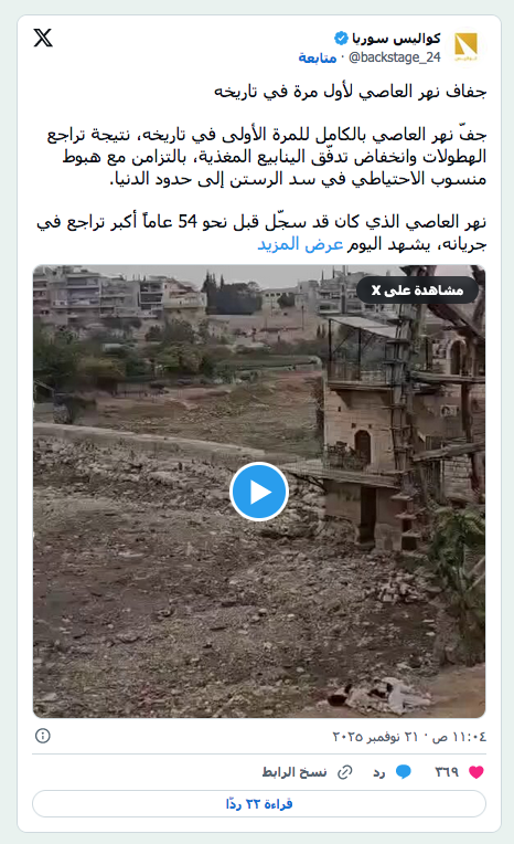 صورة مثبتة من مقطع فيديو يظهر جفاف نهر العاصي في سوريا بالكامل عرب وعالم للمرة الأولى في التاريخ… نهر العاصي يجف بالكامل في سوريا by admin 26 نوفمبر، 2025 written by admin 26 نوفمبر، 2025 62 دمشق: «الشرق الأوسط» يشهد نهر العاصي في سوريا جفافاً كاملاً للمرة الأولى في تاريخه، في حدث يشكل سابقة بالنسبة للشريان المائي الحيوي في البلاد. ويأتي هذا الانحسار المائي في وقت بلغ فيه منسوب الاحتياطي في سد الرستن الحدود الدنيا، ما يزيد من المخاطر على الزراعة والبيئة المحلية. وكانت وكالة «سانا» الرسمية قد أشارت قبل شهور إلى أن جفاف نهر الليطاني ينذر بأزمة بيئية في سهل الغاب شمال غرب سوريا، مُخلفاً وراءه أرضاً متشققة وبركاً راكدة، بعد أن كان النهر شرياناً مائياً ومصدراً للحياة، حيث أصبح الآن ساحة لمعركة ضد الجفاف والفقر. ونقلت الوكالة آنذاك عن أحد الصيادين من قرية قبر فضة قوله: «النهر لم يعد يغذينا… والجفاف ليس مجرد نقص ماء… هو موت لنمط حياة كامل». وانتشرت على مواقع التواصل الاجتماعي هذا الأسبوع، مقاطع فيديو تظهر جفاف نهر العاصي للمرة الأولى في تاريخه. وتداول ناشطون مشاهد تُظهر انحسار المياه بشكل كامل، نتيجة تراجع هطول الأمطار وانخفاض تدفّق الينابيع المغذية للنهر. ويبلغ طول نهر العاصي حوالي 571 كيلومتراً وينبع من سهل البقاع في لبنان، ويتدفق شمالًا عبر سوريا، مخالفاً الاتجاه الطبيعي لغالبية الأنهار في المنطقة التي تتجه جنوبًا، قبل أن يصب في البحر الأبيض المتوسط قرب مدينة السويدية في محافظة هاتاي بتركيا. ومن أهم المدن الواقعة على النهر حمص، وحماة، وجسر الشغور، وأنطاكية. ومع انقطاع المياه، اضطر بعض المزارعين في ريف حماة إلى اللجوء لسقاية محاصيلهم من مجاري الصرف الصحي، ما زاد المخاطر الصحية وهدّد جودة الإنتاج الزراعي، بحسب وسائل إعلام سورية. وكان نهر العاصي كان قد شهد قبل نحو 54 عامًا تراجعًا كبيرًا في جريانه، إلا أنّ الجفاف الكامل الذي يشهده يُعد سابقة تاريخية، نظرًا لدوره كشريان الري الأساسي في المنطقة. وقد أدى ذلك إلى تفاقم خسائر المزارعين وارتفاع كلفة الري، إضافة إلى تداعيات بيئية طالت الغطاء النباتي والكائنات المائية. وفي سبتمبر (أيلول) الماضي، صدر تقرير أميركي يحذر من أن شرق المتوسط يواجه أسوأ موجة جفاف منذ عقود وذكر التقرير أن سوريا أكثر البلاد المتضررة وذلك في ظل تراجع حجم الأمطار وجفاف البحار والمحيطات وانقطاع المياه في المدن لأيام طويلة. المزيد عن: تغير المناخ أخبار سوريا سوريا 0 comment 0 FacebookTwitterPinterestEmail admin previous post مايكل هراري يكتب عن: ما العمل مع لبنان؟ next post اغتيال الطبطبائي يخلخل بنية «حزب الله» القيادية You may also like هل يشكّل حصار أو احتلال جزيرة (خارك/ خرج)... 10 مارس، 2026 قوات “دلتا” تتأهب.. كيف سيكون شكل الهجوم البري... 10 مارس، 2026 الجيش السوري: «حزب الله» أطلق قذائف تجاه نقاط... 10 مارس، 2026 ارتفاع ملحوظ في أعداد الوافدين من لبنان… وسوريا... 10 مارس، 2026 لبنان: مبادرة رئاسية لنزع سلاح «حزب الله» ومفاوضات... 10 مارس، 2026 الهجمات الإيرانية تترك أثراً عميقاً وطويل الأمد في... 10 مارس، 2026 تركيا تراقب الحرب بحذر وتعزز جاهزيتها على الحدود... 9 مارس، 2026 ما مدى أهمية جزيرة “خرج” الإيرانية؟ 9 مارس، 2026 كيف ومتى تخطط واشنطن للتخلص من يورانيوم إيران... 9 مارس، 2026 القناة 12: إسرائيل تبحث سيناريوهات خروج من الحرب... 9 مارس، 2026