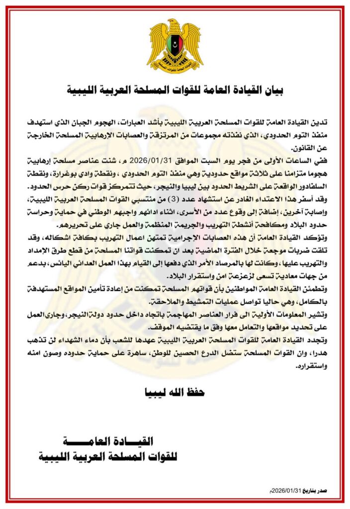 مجموعة تسمي نفسها ثوار الجنوب سيطرت لساعات على منفذ التوم الحدودي قبل أن تستعيده قوات حفتر (رويترز) عرب وعالم ماذا يحدث على حدود ليبيا الجنوبية؟ by admin 5 February، 2026 written by admin 5 February، 2026 65 معبر التوم البري مع النيجر تعرض لهجوم مسلح ومراقبون يدعون إلى احتواء المكونات القبلية وتنمية الجنوب وحمايته من الأجندات الخارجية اندبندنت عربية / كريمة ناجي صحافية @karimaneji عاد معبر التوم الحدودي بين ليبيا والنيجر إلى واجهة الأحداث بعد تعرضه لهجوم نفذته عناصر مسلحة سمت نفسها “ثوار الجنوب”، وأصدر أعيان الجنوب الليبي مساء أمس الثلاثاء، بياناً أكدوا فيه وقوفهم مع القوات المسلحة الليبية ضد الجهات الداخلية والخارجية التي تحاول زعزعة استقرار الجنوب والعودة به إلى الانفلات الأمني السابق، بحسب تعبيرهم. وقال البيان المرئي الذي تابعته “اندبندنت عربية”، إن أعيان الجنوب يستنكرون الهجوم على القوات المسلحة في معبر التوم الواقع في أقصى الجنوب الغربي لليبيا”، مشددين على أنهم “على استعداد تام للضرب بيد من حديد لكل من يحاول العبث بأمن ليبيا” مؤكدين دعهم لقوات المشير خليفة حفتر. فيما دان اتحاد شباب التبو في ليبيا، إقدام قوات موالية لخليفة حفتر على اقتحام منازل عائلة قائد غرفة عمليات تحرير الجنوب وردقو المهدي (الموجود في طرابلس)، محملين قوات حفتر المسؤولية الكاملة عن نهب ثروات الجنوب، والسيطرة القسرية على الأسواق، وتهريب المحروقات وتحويل المنطقة إلى ساحة للجريمة المنظمة، وفق ما جاء في البيان الذي يحمل توقيعهم. في بيان رسمي لها، أعلنت القوات المسلحة الليبية بقيادة المشير خليفة حفتر، مقتل ثلاثة من عناصرها ووقوع عدد من الأسرى وإصابة آخرين لم تؤكد عددهم في الهجوم الذي استهدف معبر التوم الحدودي بين ليبيا والنيجر السبت الماضي، والذي نفذته مجموعات من المرتـزقة والعصابات المسـلحة الخارجة عن القانون، وفق ما جاء في البيان. وقال البيان، إن عناصر مسلـحة شنت هجوماً متزامناً على ثلاثة مواقع حدودية وهي منفذ التوم الحدودي، ونقطة وادي بوغرارة، ونقطة السلفادور الواقعة على الشريط الحدودي بين ليبيا والنيجر، منوهاً بأن القوات المسلحة تمكنت من إعادة تأمين المواقع المستهدفة بالكامل. شريان تجاري في حديثه عن أهمية معبر التوم الحدودي قال المتخصص بالشؤون الأمنية، العميد عادل عبدالكافي، إن منفذ التوم الحدودي، يقع في نطاق المثلث الحدودي بين النيجر والتشاد وليبيا وتحديداً في أقصى الجنوب الغربي الليبي. وأكد أهمية هذا المنفذ الحدودي الذي يستمدها وفق قوله من ربطه بين ليبيا وبقية الدول الأفريقية، حيث يشكل الشريان التجاري الذي يربط بين موانئ الشمال الليبي باتجاه أفريقيا، فأغلب شحنات البضائع من الغرب أو الشرق الليبي تتجه نحو النيجر والتشاد وصولاً إلى دول الساحل والصحراء عبر منفذ التوم الحدودي. ونوه عبدالكافي بأنه “في ظل التداعيات التي تمر بها ليبيا وحالة السيولة الأمنية والانقسامات السياسية استغلت الحدود الليبية النيجرية التي تمتد على ما يقارب حوالى 342 كلم كنقطة عبور للهجرة غير النظامية وأيضاً كمنفذ لشبكات الجريمة المنظمة وما يرافقها من مرور لأسلحة مرتزقة الفيلق الأفريقي الروسي من الأراضي الليبية إلى النيجر ومالي لأن هذا المنفذ من ضمن المسارات التي تأخذه عناصر الفيلق في عملية إمدادات الأسلحة إضافة إلى المسار الجوي عبر طائرات الشحن الروسية”. وأضاف أن “أهميته تكمن في ربط حدود ليبيا الجنوب غربية مع ممر السلفادور المشترك بين ليبيا والنيجر والجزائر وهو ممر صعب السيطرة عليه من داخل الأراضي الجزائرية أو النيجرية، فيتم ذلك حصراً من الأراضي الليبية عبر الطيران العمودي أو المسير، حتى تتكمن ليبيا من تأمينه لمنع مرور إمدادات الأسلحة أو تهريب البشر والمخدرات”. بيان إعادة سيطرة القوات المسلحة العربية الليبية على منفذ التوم الحدودي (المكتب الإعلامي) وقال الخبير في الشؤون الأمنية، في حديثه مع موقع “اندبندنت