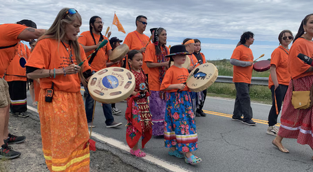 أشخاص بالغون وأطفال من أمّة سيبكنيكاتيك (Sipekne’katik) الأولى في مقاطعة نوفا سكوشا في شرق كندا يشاركون في مسيرة في شوبيناكادي في وسط المقاطعة في 21 حزيران (يونيو) 2024 بمناسبة اليوم الوطني لشعوب السكان الأصليين.