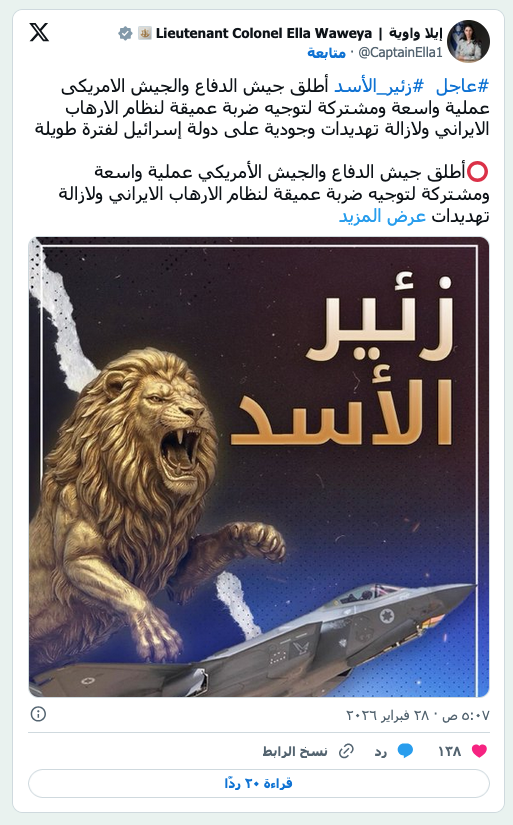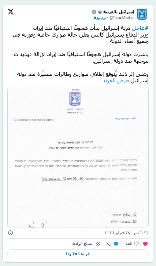 تصاعُد الدخان عقب انفجار بعد تصريح وزير الدفاع الإسرائيلي يسرائيل كاتس بأن إسرائيل شنت هجوماً استباقياً على إيران (رويترز) عرب وعالم نتنياهو عن عملية «زئير الأسد»: آن الأوان للتخلص من نير الاستبداد by admin 28 February، 2026 written by admin 28 February، 2026 86 قال إن إسرائيل وأميركا بدأتا عملية لإزالة «التهديد الوجودي» للنظام في طهران تل أبيب: «الشرق الأوسط» أعلنت إسرائيل، اليوم (السبت)، تنفيذ «هجوم وقائي» على إيران تحت اسم «زئير الأسد»، في خطوة تعد تصعيداً جديداً للنزاع المستمر منذ سنوات حول البرنامج النووي الإيراني والصاروخي. وأعلن رئيس الوزراء الإسرائيلي بنيامين نتنياهو، في مقطع فيديو بشأن الهجوم على إيران، مخاطبًا مواطني بلاده، أنه «قبل قليل، شرعت إسرائيل والولايات المتحدة في عملية لإزالة التهديد الوجودي الذي يمثله النظام الإرهابي في إيران». وقال نتنياهو في كلمته: «لا يجوز أن يُسلّح هذا النظام الإرهابي القاتل بأسلحة نووية تمكنه من تهديد البشرية جمعاء. عملنا المشترك سيخلق الظروف للشعب الإيراني الشجاع ليأخذ مصيره بين يديه». وأضاف: «لقد حان الوقت لجميع أطياف الشعب الإيراني، الفرس، الأكراد، الأذريين، البلوش، والأحوازيين، للتخلص من نير الاستبداد وإقامة إيران حرة ومسالمة». وكانت صحيفة «نيويورك تايمز» قد نقلت عن مسؤول أميركي قوله إنه جارٍ الإعداد لضربات أميركية على إيران. وقال مصدر لـ«رويترز» إن المرشد الإيراني علي خامنئي، ليس في طهران، وقد نُقل إلى مكان آمن. وأكد الرئيس الاميركي دونالد ترمب في خطاب، أن إيران هي الراعي الأول للإرهاب، مشدداً على أن هذا النظام الإرهابي لا يمكن أن يمتلك سلاحاً نووياً أبداً. يأتي هذا الهجوم، الذي سبقته حرب جوية استمرت 12 يوماً بين إسرائيل وإيران في يونيو (حزيران)، عقب تحذيرات متكررة من الولايات المتحدة وإسرائيل من أنهما ستقدمان على شن هجوم آخر إذا استمرت إيران في برامجها النووية والصاروخية الباليستية. «زئير الأسد» بدورها، أعلنت المتحدثة باسم الجيش، إيلا واوية، في بيان على حسابها على «إكس» إن الجيش الإسرائيلي، بالتعاون مع الجيش الأميركي، أطلقا عملية واسعة ومنسقة تستهدف النظام الإيراني، بهدف إزالة ما وصفه بـ«التهديدات الوجودية» على إسرائيل على المدى الطويل، مرفقة بالبيان صورة كتب عليها اسم العملية «زئير الأسد»، تظهر أسداً يزأر في وضعية الهجوم، إلى جانب طائرة حربية. وأكدت أن العملية بدأت بمهاجمة عشرات الأهداف العسكرية ضمن حملة شاملة ضد النظام الإيراني. وقالت واوية إن النظام الإيراني لم يتخلَّ عن خطته لتدمير إسرائيل، مشيرة إلى أن الجيش الإسرائيلي رصد خلال الأشهر الأخيرة استمرار محاولات إيران لتحصين وحماية وإخفاء برنامجها النووي، إلى جانب إعادة بناء مشروع إنتاج الصواريخ وتمويل وتدريب وتسليح وكلائه على الحدود الإسرائيلية، وهو ما اعتبرته تهديدًا وجوديًا ليس لإسرائيل فحسب، بل للشرق الأوسط والعالم بأسره. وأضافت أن الهجوم جاء بعد تخطيط مشترك وثيق بين الجيشين الإسرائيلي والأميركي خلال الأشهر السابقة، سمح بتنفيذ العملية بأعلى درجات التكامل والتنسيق. وأشارت الى أن الجيش الإسرائيلي أجرى استعدادات شاملة على كافة تشكيلاته، شملت الخطط الدفاعية والهجومية لضمان جاهزية التعامل مع أي تهديد محتمل. وأوضحت واوية أن رئيس الأركان وقادة الجيش يواصلون حاليًا تقييم الوضع، بينما تنتشر قوات كبيرة على مختلف الجبهات في حالة استعداد قصوى، مع التأكيد على استمرار الجيش في اتخاذ كل الإجراءات لقطع أي تهديد ضد مواطني إسرائيل في كل وقت ومكان. رجل يراقب عموداً من الدخان يتصاعد عقب انفجار مُبلغ عنه في طهران (أ.ف.ب) خطة أُعدّت منذ أشهر وقال وزير الدفاع الإسرائيلي يسرائيل كاتس: «شنت إسرائيل هجوماً وقائياً على إيران للتصدي للتهديدات التي تواجهها». وقال مسؤول في وزارة الدفاع الإسرائيلية إن العملية جرى التخطيط لها منذ أشهر بالتنسيق مع واشنطن، وإن موعد إطلاقها جرى تحد