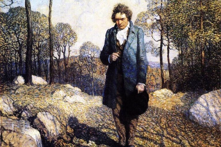 لودفيغ فون بيتهوفن (1770 – 1827) في الطبيعة لوحة بريشة أن. سي. وايث (غيتي) ثقافة و فنون هكذا عبر بيتهوفن من تمجيد البطولة إلى الاحتفاء بالطبيعة by admin 4 September، 2025 written by admin 4 September، 2025 73 بعد صدمته بـ”البطل” نابليون الذي كان يريد أن يكرس له “السيموفونية الخامسة” انتقل إلى عناصر الفرح في “السيمفونية السادسة” اندبندنت عربية / إبراهيم العريس باحث وكاتب عام 1807، وبعد أن أفاق من صدمته بـ”البطل” – نابليون دون أدنى ريب – الذي كان قد بدأ يكرس له واحداً من أهم أعماله الموسيقية، استعاد بيتهوفن صلابته، ورونقه الموسيقي، وحول ذلك العمل من عمل تمجيدي خاص ببطل اللحظة، نابليون نفسه، إلى عمل يمجد البطولة بصورة عامة. وهكذا، إذ استقر قراره على ذلك النحو، عاد للعمل على سيمفونيته الخامسة، سيمفونية البطولة التي ستصبح على الفور، ما إن قدمت إلى الناس للمرة الأولى، واحدة من أشهر أعمال ذلك الفنان العبقري، بل إنها تعتبر وحتى اليوم بنوتاتها الافتتاحية الأربع، أشهر مقطوعة في الموسيقى الكلاسيكية على الإطلاق. ونعرف أن هذه السيمفونية الخامسة تحمل من لحظات الصلابة والعنف والقوة، ما يترجم حقاً موقف بيتهوفن من مفهوم البطولة نفسه. حتى وإن كانت صورة البطل قد تغيرت بالنسبة إليه ولم يعد لها ملامح القائد العسكري الفرنسي الصغير، مما يشي بحاله الذهنية في ذلك الحين. ومع هذا، علينا لكي نضع أحوال بيتهوفن الذهنية كما كانت حين الانتهاء من هذا العمل للشروع في ما سيليه، في نصابها، أن نتذكر أن الموسيقي نفسه، كتب في الوقت عينه الذي كان فيه يستكمل السيمفونية الخامسة، سيمفونيته السادسة المعروفة شعبياً باسم “الرعوية”، التي تتميز بكونها واحدة من أكثر السيمفونيات هدوءاً ودعة والتحاماً بالطبيعة، في تاريخ الموسيقى الكلاسيكية. لقد اشتغل بيتهوفن على العملين معاً، وربما في وقت واحد. وهما قدما معاً، واحداً بعد الآخر، في الـ22 من كانون الثاني (ديسمبر) 1808 في فيينا. ومنذ ذلك الحين والناس في دهشة: كيف تمكن فنان واحد من أن يرسم الحالين في وقت واحد، وفي عملين يتناقضان في ما بينهما كل هذا التناقض؟ محاولة للإجابة عن السؤال ربما، في محاولة الإجابة عن هذا السؤال، يتعين أن نكتفي بالإشارة إلى أن بيتهوفن، بعدما صاغ في ذهنه موسيقى البطولة وعنفها، أراد أن يهدئ من نفسه وأن يعيد لموسيقاه عذوبتها التي كان عبر عنها في السيمفونية الثالثة. أو ربما، أمام هول ما كتبه في “الخامسة” أراد أن يخلق في ذاته توازناً واضحاً يريحه. ومهما كان من أمر الجواب، من المؤكد أن السيمفونية السادسة أتت أشبه بعودة الفنان للطبيعة، وربما أتت بصفتها العمل الأكثر ارتباطاً بالطبيعة وعناصرها في تاريخ الفن الموسيقي. وقد يجدر بنا هنا أن ننقل من دفاتر بيتهوفن هذا النص الدال، الذي كتبه في الوقت نفسه الذي كان فيه ينجز كتابة “السيمفونية السادسة”: “أن كل استعراض سيخسر الكثير، في الحقيقة، إن هو أراد أن يترجم كتأليف موسيقي ترجمة شديدة الأمانة. لذا علينا أن نترك إلى المستمع نفسه أمر توجيه مشاعره وأحاسيسه. من هنا، أرى أن العناوين التفسيرية، لا يمكنها إلا أن تكون سطحية. إذ، حتى ذاك الذي لا يمتلك إلا فكرة شديدة الغموض عن الريف سيكون قادراً على أن يفهم ما أريد التعبير عنه هنا، بكل سهولة. من هنا، أرى أن أي تفسير وصفي سيكون من دون فائدة. وأن من الأفضل لنا التعلق بالتعبير عن العاطفة، بدلاً من التوجه نحو التصوير بالموسيقى، السيمفونية ليست لوحة مرسومة”. غلاف السيمفونية السادسة (أمازون) كلام واضح بالتأكيد من المؤكد أن كلام بيتهوفن هذا يتسم بوضوح لا بأس به، غير أن وضوحه سيكون أكبر إن نحن تذكرناه بحذافيره ونحن نصغي بصورة دقيقة إلى السيمفونية السادسة، هذا العمل الذي لم يكف الباحثون والمؤرخون، والمستمعون العاديون عن اعتباره على مدى قرنين من الزمن حتى الآن “معلماً من معالم الانتظام والجمال” و”نموذجاً في التوازن والقوة” و”قصيدة مستوحاة مباشرة من حس عميق بروعة الطبيعة”. وتتألف الس