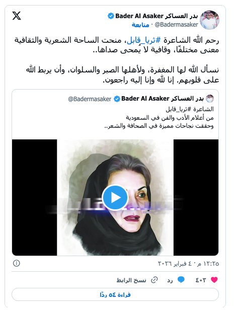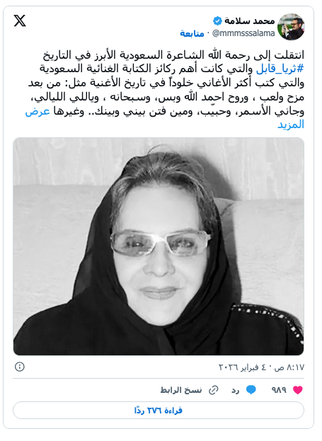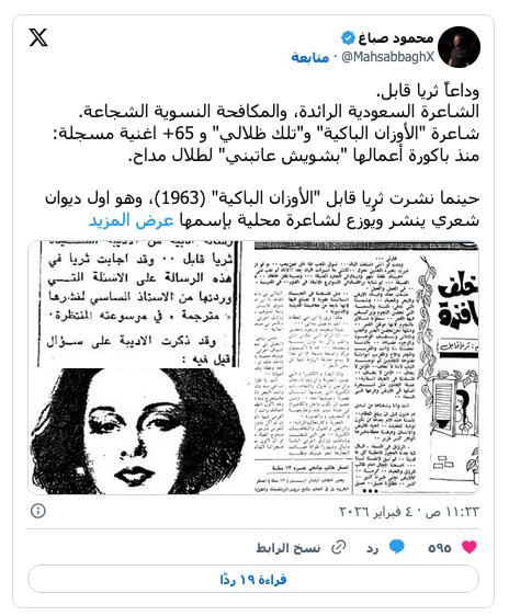 ثريا قابل عاشت حياتها بين الشعر والصحافة (مواقع التواصل) ثقافة و فنون “الأوزان الباكية” ترثي شاعرتها ثريا قابل by admin 6 فبراير، 2026 written by admin 6 فبراير، 2026 70 كانت الراحلة أول شاعرة سعودية تنشر ديواناً شعرياً فتح الطريق للسعوديات “اندبندنت عربية” ودعت السعودية وأدباؤها الشاعرة ثريا قابل بعد مسيرة صحافية وثقافية وأدبية امتدت لأكثر من خمسة عقود، تركت خلالها أثراً واضحاً في الصحافة وفي المشهد الشعري والغنائي في المملكة والعالم العربي. ورحلت قابل التي عانت خلال الأعوام الأخيرة المرض عن عمر ناهز الـ85 سنة. ورثت أقلام باكية، صاحبة “الأوزان الباكية” على منصات التواصل الاجتماعي في السعودية والخليج. قابل التي ولدت في حارة المظلوم بالمدينة الساحلية، جدة عام 1940 نشأت في بيئة حجازية غنية بالثقافة والفنون، قبل أن تواصل تعليمها في بيروت، حيث بدأت بنشر قصائدها في الصحف العربية قبل أن تصدر عام 1963 أول ديوان شعري لها بعنوان “الأوزان الباكية”، وهو أول ديوان شعري تصدره امرأة سعودية باللغة العربية الفصحى، عدّه الأدباء محطة مفصلية في تاريخ الأدب السعودي وفتح الباب أمام حضور المرأة في المشهد الشعري والفني. وإضافة إلى الشعر، مارست ثريا قابل الصحافة الثقافية، فعملت محررة وكاتبة في صحف محلية وعربية، وأدارت مجلة “زينة” خلال الثمانينيات، وكتبت لمجلات وصحف مثل “عكاظ” و”البلاد” و”الأنوار”. ووصفتها بعض المصادر الثقافية بأنها أسهمت في توسيع مساحة حضور المرأة السعودية في المجال الأدبي والإعلامي في وقت كانت مشاركة النساء محدودة. والراحلة التي كتبت بمخيلة واسعة، ارتبط اسمها أيضاً بالغناء السعودي، إذ تحول عدد كبير من قصائدها إلى أغانٍ شهيرة غناها كبار الفنانين في السعودية والخليج، ومن أبرز هذه الأغاني “اديني عهد الهوى” “ومن بعد مزح ولعب” و”جاني الأسمر” و”ولا وربي” و”مين فتن بيني وبينك”. “الأوزان الباكية” وتغنى بأشعارها كبار المطربين العرب، ومن بينهم طلال مداح ومحمد عبده وفوزي محسون، مما أكسب شعرها جمهوراً واسعاً وذاكرة موسيقية خالدة. وفي حياتها، أشاد أدباء سعوديون وعرب بمكانتها الشعرية، إذ اعتبرها النقاد والمتذوقون “صوت جدة” ووجدان مجتمعها، واصفين ديوانها “الأوزان الباكية” بأنه ثورة هادئة في المشهد الأدبي السعودي. ولازم الراحلة الأديبة، لقب “خنساء القرن العشرين”، وهو اللقب الذي أطلقه عليها الأديب السعودي محمد حسن عواد، تقديراً لعمق إحساسها وجرأتها في التعبير عن المشاعر الإنسانية. وأكد كثير من الأدباء أن لغتها تمزج بين بساطة اللفظ وعمق المعنى، وتربط بين التراث الحجازي والوجدان الشعبي، وأن أعمالها الشعرية والغنائية أسهمت في ترسيخ حضور المرأة في الساحة الأدبية والموسيقية. ورثاء الشاعرة الصحافية جمع عدداً من الشعراء والمسؤولين، ومن بينهم بدر العساكر، مدير المكتب الخاص وسكرتير ولي العهد السعودي، وهو الذي اعتبر أن “مسيرتها منحت الساحة الثقافية والشعرية معنى مختلفاً”. وكتب خالد السهيل وهو عضو في جمعية الكتاب السعوديين، “حالة شعرية فريدة بمفردات حجازية مشبعة بالعاطفة والشجن، تركت بصمة في الغناء السعودي”. وبرحيلها، فقدت الساحة الأدبية والثقافية السعودية واحدة من أبرز رائدات الشعر النسائي والصحافة الثقافية، تاركة إرثاً غنياً من النصوص الشعرية والمقالات الأدبية التي أثرت في الحياة الثقافية والفنية في المملكة، وأسهمت في تشكيل جزء من الذاكرة الشعرية والغنائية في العالم العربي. المزيد عن: ثريا قابل السعودية الشعر النسائي جدة حارة المظلوم 0 comment 0 FacebookTwitterPinterestEmail admin previous post سيف الإسلام القذافي سيُدفن في معقل قبيلة مؤيدة لوالده next post “عميلنا في هافانا” لغراهام غرين: حين يحدث أن تقلد الحياة الفن You may also like كيف نتفلسف: دليل استخدام و5 ركائز أساسية 26 أبريل، 2026 عندما يغير الكتاب فهم القارئ لنفسه والعالم 26 أبريل، 2026 الممثلة الألمانية ساندرا هولر تتألق عالميا بع