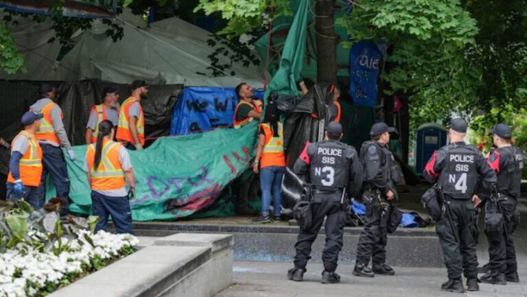 موظفون في بلدية مونتريال يقومون صباح اليوم بتفكيك المخيم الاحتجاجي الداعم للفلسطينيين في ميدان فيكتوريا في وسط مونتريال تحت أنظار عناصر الشرطة (بالزي الأسود). الصورة: La Presse canadienne / Christinne Muschi CANADAكندا عربي الشرطة تفكك المخيم الاحتجاجي في وسط مونتريال by admin 6 يوليو، 2024 written by admin 6 يوليو، 2024 373 راديو كندا الدولي / RCI قام عناصر من جهاز شرطة بلدية مونتريال (SPVM) في وقت مبكر من صباح اليوم بتفكيك المخيم المؤيد للفلسطينيين الذي أبصر النور في ميدان فيكتوريا في وسط مونتريال قبل أسبوعين. فبُعيْد الساعة الخامسة صباحاً دخلت مفرزة من عناصر مكافحة الشغب التابعة لشرطة مونتريال إلى المخيم الاحتجاجي الذي أُقيم مقابل مكاتب صندوق الودائع والاستثمارات الكيبيكي (CDPQ). وبحسب ما رصده راديو كندا، غادر نحو خمسة عشر متظاهراً المخيم دون إبداء أيّ مقاومة، وجرت عملية الشرطة بهدوء. وانتشر عناصر شرطة على ظهور الخيل وعلى دراجات هوائية من باب الاحتياط. وبدأ موظفو البلدية بتفكيك المخيم وجمع المواد التي تركها المتظاهرون وراءهم في وقت لاحق من الصباح. إيمّا جوبير تجرّ أمتعتها الشخصية وخيمتها بعد أن طردتها الشرطة من مخيم ميدان فيكتوريا في وقت مبكر من صباح اليوم.الصورة: The Canadian Press / Christinne Muschi ’’قالوا لنا إننا نتعدى على ممتلكات الغير وإنهم يريدون تفكيك مخيمنا، وإننا في مكان عام وإنّ علينا المغادرة‘‘، قالت إيمّا جوبير التي كانت في المخيم عند وصول الشرطة. ’’كانوا يركلون الخيام وكل ما إلى ذلك. (…) حاصرونا جميعاً في زاوية، وفي النهاية سمحوا لنا بالخروج ببطء أكثر قليلاً (…) في طابور. ما فعلوه كان عدوانياً للغاية، كان فيه تهديد‘‘، أضافت جوبير عن عناصر الشرطة. يُذكر أنه عندما أقامت مجموعة ’’سحب الاستثمارات من أجل فلسطين‘‘ المخيّم في ميدان فيكتوريا في 22 حزيران (يونيو)، طلبت من صندوق الودائع والاستثمارات الكيبيكي أن يقطع علاقاته المالية مع الشركات الإسرائيلية التي تتهمها المجموعة بالتواطؤ في الهجوم الذي تقوم به إسرائيل في قطاع غزة الفلسطيني منذ خريف العام الماضي. كما طالبت المجموعة حكومة كيبيك بإغلاق مكتبها التمثيلي في تل أبيب، كبرى مدن إسرائيل وعاصمتها الاقتصادية، الذي بدأ نشاطه خلال الحرب الحالية المستمرّة منذ تسعة أشهر بين إسرائيل وحركة حماس الفلسطينية. مكاتب صندوق الودائع والاستثمارات الكيبيكي (CDPQ) في مونتريال (أرشيف).الصورة: Radio-Canada / Ivanoh Demers وفي مؤتمر صحفي عقدته يوم الأربعاء جدّدت المجموعة مطالبتها صندوق الودائع والاستثمارات الكيبيكي بأن ’’يسحب استثمارات بقيمة 14,2 مليار دولار يملكها في 87 شركة متواطئة مع الاحتلال الإسرائيلي والإبادة الجماعية المستمرة (في قطاع غزة)‘‘. وكانت إدارة الصندوق قد أصدرت بياناً قالت فيه إنّها لا تقوم بـ’’أيّ استثمار جديد في مناطق الحرب حتى إشعار آخر‘‘، مضيفةً أنّ إجماليّ استثمارات الصندوق في إسرائيل يمثل أقلّ من 1% من محفظته الاستثمارية، لكنها لم تذكر ما إذا كانت ستسحب هذه الاستثمارات من إسرائيل. من جهتها، أكّدت بلدية مونتريال في بيان صحفي أصدرته اليوم أنّ تفكيك المخيم في ميدان فيكتوريا حدث بهدوء، وذكّرت بأنّ حق التظاهر هو ’’حق أساسي تحميه الشرعات الحقوقية‘‘ لكن لا يمكنه أن ’’يعيق الحق في الأمن وحرية الحركة في الأماكن العامة‘‘. ’’لا يمكن احتلال مكان عام بشكل دائم وثابت، وبغضّ النظر عن السبب. يجب أن تبقى الأماكنُ العامة عامةً‘‘، أضافت البلدية في بيانها. عمدة مونتريال فاليري بلانت تتحدث اليوم في مؤتمر صحفي.الصورة: Radio-Canada ’’شكّلت منشآت كهذه مشكلات كبيرة تتعلق بالسلامة، سواءً بالنسبة للأشخاص الموجودين في الموقع أو لأولئك الذين يتنقلون ويعملون في مكان قريب‘‘، قالت اليوم عمدة مونتريال فاليري بلانت عن منشآت مخيم ميدان فيكتوريا في مؤتمر صحفي، ’’وبالإضافة إلى ذلك، فهي كانت مخالفة للوائح البلدية‘‘. وكان وزير الأمن العام في حكومة مقاطعة كيبيك، فرانسوا بو