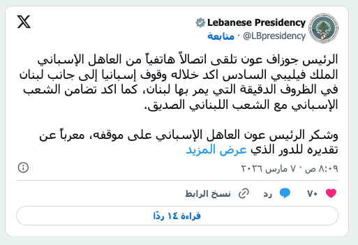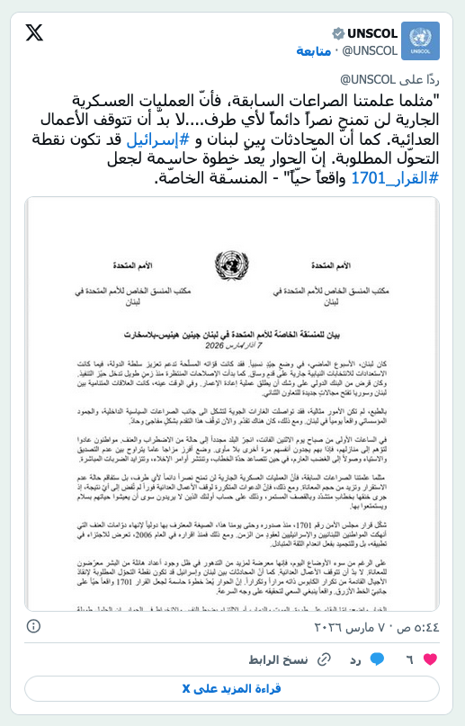 رئيس الوزراء اللبناني نواف سلام يتحدث إلى الصحافيين في مقر الحكومة في بيروت 3 ديسمبر 2025 (رويترز) عرب وعالم سلام لـ«الشرق الأوسط»: نرفض ربط مصير لبنان بمصالح إيران by admin 8 مارس، 2026 written by admin 8 مارس، 2026 88 قال إن «حزب الله» أدخل البلاد في حرب لا تريدها الشرق الاغوسط/ بيروت: ثائر عباس أكد رئيس الحكومة اللبنانية القاضي نواف سلام لـ«الشرق الأوسط»، أن الدولة تقوم بكل ما في وسعها سياسياً ودبلوماسياً لوقف الحرب الإسرائيلية على لبنان، وتقليل تداعياتها الكارثية على اللبنانيين عموماً، وعلى النازحين خصوصاً. وأشار الرئيس سلام إلى أن المساعي الدبلوماسية لم تنتج بعد ما نرجوه بسبب ارتباط الوضع اللبناني بأزمات المنطقة والحرب الدائرة فيها، التي كان يمكن لنا أن نتجنب أضرارها، لولا الخطأ الاستراتيجي الذي ارتكبه «حزب الله» بالانزلاق فيها، وأدى إلى ما أدى إليه من نتائج كارثية على لبنان، وعلى البيئة التي يدعي الحزب أنه يريد حمايتها. وكرر سلام أن هذه الحرب فرضت على كل اللبنانيين، وهي ليست من مصلحتهم، ووقفها اليوم قبل الغد هو حاجة وطنية ملحة. وإذ رأى الرئيس سلام أن المساعي الخارجية تصطدم بتشدد إسرائيلي كبير، وانشغال الولايات المتحدة بالحرب الدائرة، وتداعياتها الخطيرة على أمن منطقة الخليج العربي، مستغرباً ومستنكراً استهدافها من قبل إيران التي تهدد من خلال هذه الاستهدافات أمن المنطقة التي مدت إليها يد الصداقة ذات يوم، وجاهرت برفضها للحرب قبل حصولها. وأكد سلام عزم الحكومة على تنفيذ قراراتها الأخيرة (التي حظرت نشاطات «حزب الله» الأمنية والعسكرية)، وأن الدولة من قوى مسلحة وقضاء تقوم بواجبها في هذا الإطار، لكن ظروف الحرب تجعل التطبيق أكثر صعوبة. كما أشار إلى أن التشدد في موضوع التأشيرة للإيرانيين، مرده المعلومات التي توفرت للأجهزة المعنية عن النشاطات التي يقوم بها أعضاء يرجّح أنهم منتسبون للحرس الثوري الإيراني من شأنها أن تعرض الأمن القومي اللبناني للخطر. وأوضح أن لبنان رصد مغادرة عدد من هؤلاء بعد صدور القرار، مشدداً على أن لبنان يريد أفضل العلاقات مع إيران، لكن من دولة لدولة، ورافضاً بشدة ربط مصير اللبنانيين بمصالح دولة أخرى كما حصل. وتحدث الرئيس سلام عن حجم المعاناة الإنسانية التي نجمت عن التهجير الكبير لأهالي الجنوب وضواحي بيروت. وأشار إلى أن الحكومة تسعى بكل إمكاناتها للتخفيف من وقع الأزمة وتأمين الأساسيات التي يحتاجها هؤلاء من مأوى وغذاء ودواء، وهو تحد كبير بسبب ضعف إمكانات الدولة، مشيراً إلى ما يشرف عليه شخصياً في هذا الإطار من خلال غرفة عمليات وحدة الكوارث في السراي الحكومي. الرئيس جوزيف عون مجتمعاً قبل يومين بحضور قائدِ الجيش العماد رودولف هيكل مع رئيس أركان القوات المسلحة الفرنسية موفداً من الرئيس الفرنسي إيمانويل ماكرون (الرئاسة اللبنانية) في غضون ذلك، تواصل الحراك الفرنسي الخجول الساعي إلى إيجاد حلول للأزمة، إذ اتصل الرئيس الفرنسي إيمانويل ماكرون بالرئيس اللبناني جوزيف عون للمرة الثالثة خلال يومين، لكن من دون تحقيق خروقات تذكر، كما أكدت مصادر وزارية مقربة من الرئاسة اللبنانية. وقالت المصادر لـ«الشرق الأوسط»، إن الأمور تحتاج إلى مزيد من الوقت للنضوج، متوقعةً أن يشهد منتصف الأسبوع الحالي تحركاً جدياً، خصوصاً مع الجانب الأميركي الذي يتواصل معه عون من أجل إيجاد المخارج. وتلقى عون أيضاً اتصالاً هاتفياً من العاهل الإسباني الملك فيليبي السادس أكد خلاله وقوف إسبانيا إلى جانب لبنان في الظروف الدقيقة التي يمر بها لبنان. في المقابل، قال وزير الدفاع الإسرائيلي يسرائيل كاتس، للحكومة اللبنانية، إن عليها نزع سلاح «حزب الله» وإلا فستدفع «ثمناً باهظاً». وأضاف كاتس في بيان: «ليست لدينا أي مطالبات بالسيادة على أراضٍ في لبنان، لكننا لن نقبل بموقف يتجدد فيه ما ظل قائماً لسنوات عديدة، وهو إطلاق النار من الأراضي اللبنانية نحو دولة إسرائيل». وتابع: «لذلك نحن… نحذر: تحركوا واتخ