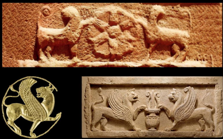 نقش واجهة قبر الحِجْر، يقابله نقش من إيوان مملكة الحضر، وقطعة ذهبية أخمينية ثقافة و فنون محمود الزيباوي يكتب عن: لبوءتا الحِجْر المتواجهتان مشهد فريد في الموقع الأثري الأكثر شهرة تحرسان قبراً متواضعاً by admin 8 ديسمبر، 2023 written by admin 8 ديسمبر، 2023 299 تبدو لبوءتا الحِجْر أشبه بحيوانين من الغريفين ظهرا هنا مجرّدين من أجنحتهما، ويبدو حضورهما استثنائياً في هذه البقعة الشرق الاوسط / محمود الزيباوي تحوي جبال مدينة الحِجْر الأثرية عشرات المقابر المنحوتة في الصخر، تمثّل ذروة القيمة الآثارية لمحافظة العُلا. تعود هذه المقابر إلى مملكة العرب الأنباط التي امتدت من جنوب بلاد الشام إلى السواحل الشمالية للبحر الأحمر، وضمّت منطقة الحِجْر في منتصف القرن الأول قبل الميلاد. تتميّز مجموعة من هذه المقابر بواجهاتها المزينة بالنقوش الزخرفية، وتتفرّد إحدى هذه الواجهات بنقش تصويري لا نجد ما يشابهه في هذا الموقع الأثري، يمثّل كما يبدو لبوءتين متواجهتين. تقع هذه الواجهة إلى الشرق من منطقة الخريمات، على مقربة من قبر كبير يُعرف بقصر البنت، وهي من الواجهات المتواضعة من حيث الحجم والبناء، وتتبع في تكوينها النسق الذي ساد في هذا البقعة من مملكة الأنباط. يحدّها عمودان مجرّدان يعلوهما تاجان بسيطان مسطحان يخلوان من أي زينة. فوق هذين العمودين، تمتدّ عارضة أفقية بارزة تعلوها سلسلة من سبعة مثلثات هرمية مدرّجة. في وسط النصف الأسفل من الواجهة، يستقر باب المقبرة المفتوح وسط عمودين مشابهين أصغر حجماً، وفوق هذين العمودين تمتد عارضة أفقية بسيطة تعلو الباب. تتحوّل هذه العارضة المسطّحة إلى أرض يابسة يسكنها حيوانان من فصيلة السنوريات يصعب تحديد صنفهما بسبب غياب ملامح رأسيهما. وسط هذين الحيوانين، تحلّ أسطوانة وردية من الصنف الذي يُعرف تقليدياً باسم الأسطوانة الأشورية في قاموس علم الآثار، وهي على شكل زهرة الربيع اللؤلوئية، وتتكوّن من ست بتلات موزعة هندسياً حول قرص دائري يشكّل وسط هذه الزهرة. يظهر الحيوانان في صورة واحدة جامعة. نراهما متواجهين في وضعية جانبية، وهما يديران رأسيهما نحو الخلف، منتصبين بثبات على ثلاثة قوائم، رافعين القائمة الأمامية اليمنى نحو الأعلى. وتلامس هاتان القائمتان المرفوعتان الأسطوانة الوردية، كأنهّما ترفعان بها نحو الأعلى. يبلغ طول هذه الأسطوانة 40 سنتمتراً، وهي من العناصر التشكيلية التي يتكرّر حضورها على واجهات حجرات الحِجْر الجنائزية، وطول كل من الحيوانين معادل له. النسب التشريحية الخاصة بكل من البهيمتين متناسقة وصحيحة، والقالب التصويري تجريدي، ويغلب عليه طابع التحوير الهندسي الاختزالي. يظهر ذيل كل من الحيوانين بشكل لافت يتمثّل في انتصابه عمودياً، والتفاف طرفه بشكل لولبي حلزوني. يُعيد هذا الذيل اللولبي إلى الذاكرة حضور الأسود المجنّحة التي تزيّن إفريزاً من محفوظات متحف اللوفر الفرنسي، مصدره قصر داريوس الأول في مدينة سوسة الأثرية، على بعد 140 كلم شرق نهر دجلة. شُيّد هذا القصر بين عام 522 وعام 486 قبل المسيح، وتُمثل الأسود المجنّحة التي تزيّن إفريزه شكلاً من أشكال حيوان أسطوري يجمع بين الأسد والنسر، ويُعرف بـ«الغريفين»، وقد تحدث قدماء الإغريق عن هذا الحيوان المهيب الذي امتلك قوة ملك الوحوش وقوة ملك الطيور، ونقلوا روايات تقول إنه كان يبني عشه من الذهب الذي كان يحمله من أعالي قمم الجبال إلى الأرض، كما جعلوا منه حارساً للكنوز والممتلكات التي لا تقدّر بثمن. فنيّاً، ظهر «الغريفين» أوّلاً خلال الألفية الثالثة قبل الميلاد في بلاد عيلام التي تقع جنوب غرب الهضبة الإيرانية، واتّخذ أشكالاً متعددة في هذا العالم الذي مثّل حضارة ما قبل إيرانية قديمة، توسّعت في الشرق الأدنى القديم، وعُرفت باسم سوزيانا، نسبة إلى عاصمتها سوسة. بعدها، دخل «الغريفين» العالم الإغريقي الواسع، واتخذ صورة حيوان له جسم أسد ورأس وجناحَا نسر، وانتشرت هذه الصورة انتشاراً واسعاً في مجمل الميادين الفنية. في ا
