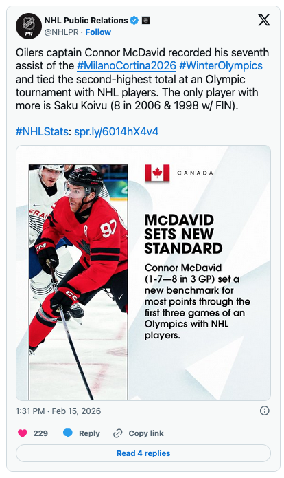 Connor McDavid of Team Canada is chased by Jules Boscq of Team France during third period Olympic hockey action at the 2026 Milan Cortina Winter Olympics in Milan, Italy on Sunday, February 15, 2026. (THE CANADIAN PRESS/Nathan Denette) CANADAHALIFAX news Canada’s Connor McDavid makes Olympic tournament history by admin 15 فبراير، 2026 written by admin 15 فبراير، 2026 48 CITYnews halifax / By Sportsnet Connor McDavid just can’t stop racking up points. With his third-period goal against France on Sunday, McDavid became the first NHLer in the Olympics to register three points in three consecutive games, while his nine points are the most through the first three games of an Olympic tournament with NHL players. Not only that, but the Team Canada star has also set the record for the most points in an Olympic tournament by a Canadian NHLer with nine. His seven assists also rank second amongst NHLers at a single tournament, just one behind Finland’s Saku Koivu, who totalled eight helpers twice (1998, 2006). McDavid now sits two points shy of tying Teemu Selanne’s single tournament point record of 11. Seeing the 29-year-old’s name on the score sheet is far from a rarity, as McDavid has been the NHL’s most prolific point producer since entering the league in 2015. As the first-overall pick, McDavid totalled a league-best 1,178 points, 151 more than his Oilers teammate Leon Draisaitl, who sits second. McDavid has led the NHL in points five times in his career, while winning five Art Ross Trophies and three Hart Trophies. 0 comment 0 FacebookTwitterPinterestEmail admin previous post What’s open and closed on Heritage Day? next post دليلك لأقوى مسلسلات رمضان… دراما 2026 تستوحي حكاياتها من الواقع You may also like كنديون عالقون في الإمارات العربية المتحدة بسبب الحرب 6 مارس، 2026 دومينيك لوبلان غدا في واشنطن تحضيرا لمراجعة اتفاق... 6 مارس، 2026 ‘A terrible idea’: Halifax to raise parking fees,... 6 مارس، 2026 Man found with gunshot wound in Dartmouth 5 مارس، 2026 Dartmouth director makes feature film debut amid N.S.... 5 مارس، 2026 Human remains found in Bridgewater deemed ‘suspicious’ 5 مارس، 2026 Cuts to benefits for caregivers in N.S. will... 5 مارس، 2026 كأس العالم لكرة القدم : ارتفاع أسعار غرف الفنادق... 5 مارس، 2026 الشرق الأوسط : مارك كارني يؤكّد أنّ كندا... 5 مارس، 2026 Hundreds rally against arts and culture cuts in... 5 مارس، 2026