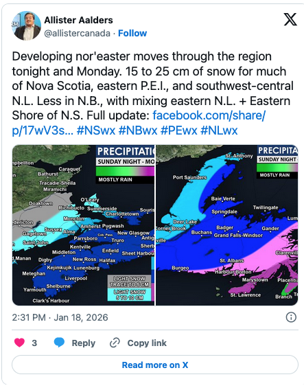 Slushy roads and snow causes headaches for some commuters. (Mark Hodgins_ CityNews) CANADAHALIFAX news N.S. 15 to 20 cm snow on the way by admin 18 يناير، 2026 written by admin 18 يناير، 2026 52 CITYnews halifax / By Rachel Morgan Most of Nova Scotia is set to get a fresh dumping of snow. Environment Canada has issued a yellow snowfall warning for most of the province, forecasting 15 to 25 cm of snow Sunday evening overnight into Monday. Temperatures are expected to hover near zero, creating dense and wet snow. This can make clearing very difficult. “Take frequent breaks and avoid strain when clearing snow,” the weather authority says. The precipitation will also make travel difficult so if you have errands to run it’s best to get them done in the morning. Snow is expected to lighten up again by Monday morning. Winter parking ban in effect Halifax Regional Municipality has issued an overnight winter parking ban which will be in effect from 1 a.m. to 6 a.m. Monday morning to allow crews to properly clear roads and sidewalks. “Vehicles must be off municipal streets during the hours noted above,” the city said. “Regardless of the status of an overnight winter parking ban, or whether you have received a notification, vehicles can be towed, day or night, at any time of year, if they are interfering with snow-clearing operations, as per Section 139 of the Nova Scotia Motor Vehicle Act.” Vehicles hanging out of a driveway or parked on the sidewalk are prone to damage and become obstacles for crews that make clearing more difficult. The municipality says anyone obstructing sidewalk clearing will be ticketed. 0 comment 0 FacebookTwitterPinterestEmail admin previous post مكاسب المغرب من احتضان كأس الأمم الأفريقيةد next post Despite Liberal pivot, Conservatives to keep pressing for tougher crime measures in Canada You may also like ‘A terrible idea’: Halifax to raise parking fees,... 6 مارس، 2026 Man found with gunshot wound in Dartmouth 5 مارس، 2026 Dartmouth director makes feature film debut amid N.S.... 5 مارس، 2026 Human remains found in Bridgewater deemed ‘suspicious’ 5 مارس، 2026 Cuts to benefits for caregivers in N.S. will... 5 مارس، 2026 كأس العالم لكرة القدم : ارتفاع أسعار غرف الفنادق... 5 مارس، 2026 الشرق الأوسط : مارك كارني يؤكّد أنّ كندا... 5 مارس، 2026 Hundreds rally against arts and culture cuts in... 5 مارس، 2026 NSCAD teaching assistants on strike after negotiations come... 5 مارس، 2026 Schools in Halifax, other regions delay opening due... 5 مارس، 2026