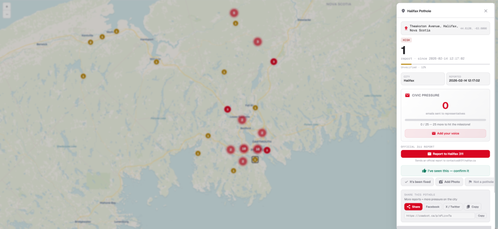 CityNews file photo of a pothole on the road. CANADAHALIFAX news N.S. resident builds crowdsourced pothole map in effort to promote civic responsibility by admin 22 February، 2026 written by admin 22 February، 2026 41 CITYnews halifax/ By Rachel Morgan As winter begins to wane, you’d think road conditions would improve, but one Nova Scotia resident is becoming increasingly frustrated. “Spring thaw is coming, and Canadian roads are about to get a lot worse,” Jason Turnbull, a resident of Cape Breton, told CityNews. That’s why he created RoadRot, a crowdsourced map that shows where potholes exist across the province. “I got fed up hitting the same potholes every day and realized there was no easy way to see where the worst roads were,” he said. “Municipal 311 systems take reports but don’t show the public what’s been reported or where usually.” Halifax Regional Municipality says it has two priority levels for potholes that determine when they get repaired. Priority one potholes are classified as at least 25 centimeters in diameter and eight centimeters in depth and are repaired within 30 days of reporting. All other potholes are labelled as priority two and can take up to 12 months to repair. The municipality says repair service standards are in effect Apr. 1 through Nov. 30, but some repairs have already begun in 2026. Last week the municipality advised residents that repairs would begin on Robie Street, Agricola Street, Barrington Street and North Street. A screenshot of a data point on roadrot.ca. But Turnbull said this process is relatively hidden from the public. His map brings a classification of potholes out into the open, which can both inform residents and push for civic accountability. “The site ranks the worst roads by city, and there’s a one-click feature to email your municipal, provincial, or federal representative about the potholes in your area. We track how many people have emailed about each pothole,” he said. “Potholes that cause damage or are ignored should be in the public record. Public pressure works and I want to make it easy.” RoadRot was launched earlier this month. In the first two weeks, he said there were over 120 reports across Cape Breton and now he is looking for people to add data for other regions across the province. “Just visit roadrot.ca on any phone or computer. Tap the map where you see a pothole, rate its severity, optionally add a photo, and submit. No signup, no app download, completely anonymous,” he said, adding citizens can also confirm others’ reports to help verify the data. RoadRot is part of a series of crowdsourced civic accountability tools that Turnbull is creating. He also owns WattRot.ca to compare power bills across Canada, and recently released erstat.ca which pulls Nova Scotia Health wait time data to allow residents to choose a threshold for which they want an alert for when the wait time drops below. 0 comment 0 FacebookTwitterPinterestEmail admin previous post Sidney Crosby ruled out of gold medal hockey game against USA next post USA defeats Canada in overtime to win Olympic gold You may also like Diesel prices to shift again in Nova Scotia... 6 March، 2026 Halifax Water investigating ‘privacy incident’ on its online... 6 March، 2026 Halifax teens lament the loss of government program... 6 March، 2026 Spring Garden area businesses call out paid parking... 6 March، 2026 Five men face obstruction charges related to Dartmouth... 6 March، 2026 مارك كارني يعقد شراكة استراتيجية مع اليابان 6 March، 2026 أوتاوا بدأت أول رحلة جوية لإعادة مواطنيها من... 6 March، 2026 كنديون عالقون في الإمارات العربية المتحدة بسبب الحرب 6 March، 2026 دومينيك لوبلان غدا في واشنطن تحضيرا لمراجعة اتفاق... 6 March، 2026 ‘A terrible idea’: Halifax to raise parking fees,... 6 March، 2026