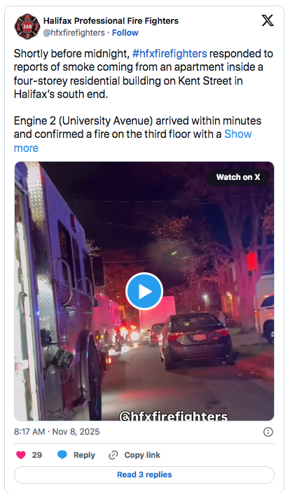 CANADAHALIFAX news Resident rescued for third floor apartment fire by admin 9 November، 2025 written by admin 9 November، 2025 62 CITYnews halifax / By Rachel Morgan On person was treated for injuries after being rescued from an apartment fire late Friday night. In a post on X, the Halifax Professional Fire Fighters (HPFF) union said fire services received reports of smoke coming from an partment inside a four-storey residential building on Kent Street in Halifax’s south end. The call came shortly before midnight and within minutes the first firefighters were on the scene, the union said. Responders confirmed there was a fire in a third floor unit and that there was a resident trapped inside. HPFF said firefighters safely rescued the occupant and placed them in the care of Emergency Health Services (EHS). In an email statement, a spokesperson for EHS told CityNews the person was treated at the scene. Firefighters were able to prevent the spread of the fire to nearby units. The fire was extinguished in the unit of origin leaving minimal damage. After air quality checks, residents were allowed back inside. Fire Services have not stated the cause of the fire. 0 comment 0 FacebookTwitterPinterestEmail admin previous post Abracadabra! Halifax producer Cirkut on how Lady Gaga’s spell landed him Grammy noms next post ’’كورال التراث الشرقي‘‘ يستعيد صياغة إرث زياد الرحباني الطليعي You may also like Diesel prices to shift again in Nova Scotia... 6 March، 2026 Halifax Water investigating ‘privacy incident’ on its online... 6 March، 2026 Halifax teens lament the loss of government program... 6 March، 2026 Spring Garden area businesses call out paid parking... 6 March، 2026 Five men face obstruction charges related to Dartmouth... 6 March، 2026 مارك كارني يعقد شراكة استراتيجية مع اليابان 6 March، 2026 أوتاوا بدأت أول رحلة جوية لإعادة مواطنيها من... 6 March، 2026 كنديون عالقون في الإمارات العربية المتحدة بسبب الحرب 6 March، 2026 دومينيك لوبلان غدا في واشنطن تحضيرا لمراجعة اتفاق... 6 March، 2026 ‘A terrible idea’: Halifax to raise parking fees,... 6 March، 2026