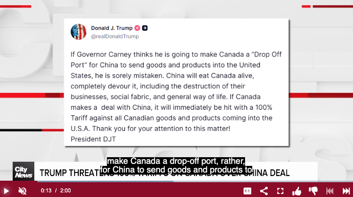 Referring to Prime Minister Mark Carney as “governor,” Trump's social media post Saturday morning says Canada cannot become a “Drop Off Port” for China to send products into the U.S. CANADAHALIFAX news Trump threatens ‘Governor Carney’ with 100 per cent tariffs over China deal by admin 25 January، 2026 written by admin 25 January، 2026 66 CITYnews halifax / By John Marchesan U.S. President Donald Trump is threatening to impose 100 per cent tariffs on Canada if it goes through with a trade deal with China. https://canadavoice.info/wp-content/uploads/2026/01/Trump-threatens-Governor-Carney-with-100-per-cent-tariffs-over-C.mp4 Referring to Prime Minister Mark Carney as “governor,” his old insult for former prime minister Justin Trudeau, the president’s social media post Saturday morning says Canada cannot become a “Drop Off Port” for China to send products into the U.S. “China will eat Canada alive, completely devour it, including the destruction of their businesses, social fabric, and general way of life,” writes Trump. “If Canada makes a deal with China, it will immediately be hit with a 100% Tariff against all Canadian goods and products coming in the U.S.A.” A few hours after that post, Trump added that “the last thing the World needs is to have China take over Canada. It’s NOT going to happen, or even come close to happening!” without elaborating further. In response to Trump’s Saturday morning threat, Canadian officials took to social media on Saturday afternoon to clarify for Trump that recent talks with China were to resolve “several important tariff issues” between the two countries. “There is no pursuit of a free trade deal with China. What was achieved was resolution on several important tariff issues,” wrote Dominic LeBlanc, the Minister responsible for Canada-U.S. trade relations. “As the Prime Minister said this week, Canada and the United States have built a remarkable partnership in our economy and security — and we will remain focused on ensuring the future of that relationship will benefit workers and businesses on both sides of our border.” Several Liberal cabinet ministers echoed LeBlanc’s response as they gathered on Parliament Hill Saturday for caucus meetings. “It is what it is,” said Mark Miller, Minister of Canadian Identity and Culture. “You have to take these things seriously, but we’re not negotiating a free trade agreement with China. It’s a serious statement, we take it seriously, but we have to control what we control.” “I try not to focus too much on tweets that you see on social media, I try to focus on the policies that we can put in place,” added Justice Minister Sean Fraser. “We need to build an economy that can stand on its own two feet, making it easier to do big things at home, diversifying into new markets around the world.” Earlier this month, Carney committed to dropping Canada’s 100 per cent tariff on Chinese-made electric vehicles in exchange for tariff reductions on Canadian agricultural products, including lobsters, crabs and canola. Trump initially had said that agreement was what Carney “should be doing and it’s a good thing for him to sign a trade deal.” Carney’s office did not immediately respond to a request for comment. Most Canadian goods are shipped to the U.S. without tariffs under the Canada-U.S.-Mexico Agreement, and it was not immediately clear if Trump’s new tariffs would apply to those products. That trade agreement is up for review this year. Carney has not yet reached a deal with Trump to reduce some of the tariffs that he has imposed on key sectors of the Canadian economy not protected by CUSMA. Trump’s threat came amid an escalating war of words with Carney as the Republican president’s push to acquire Greenland strained the NATO alliance. Trump had commented while in Davos, Switzerland, this week that “Canada lives because of the United States.” Carney shot back that his nation can be an example that the world does not have to bend toward autocratic tendencies. Carney has emerged as a leader of a movement for countries to find ways to link up and counter the U.S. under Trump. Speaking in Davos before Trump, Carney said, “Middle powers must act together because if you are not at the table, you are on the menu,” and he warned about coercion by great powers — without mentioning Trump’s name. The prime minister received widespread praise and attention for his remarks, upstaging Trump at the World Economic Forum. The prime minister even spoke of a “rupture” between the U.S. under Trump and its Western allies that would never be repaired. Trump later revoked his invitation to Carney to join the president’s “Board of Peace” that he is forming to try to resolve global conflicts. Trump’s push to acquire Greenland has come after he has repeatedly needled Canada over its sovereignty and suggested it also be absorbed by the United States as a 51st state. He resumed that this week, posting an altered image on social media showing a map of the United States that included Canada, Venezuela, Greenland and Cuba as part of its territory. Canada is the top export destination for 36 U.S. states. Nearly $3.6 billion Canadian (US $2.7 billion) worth of goods and services cross the border each day. About 60% of U.S. crude oil imports are from Canada, as are 85% of U.S. electricity imports. Canada is also the largest foreign supplier of steel, aluminum and uranium to the U.S. and has 34 critical minerals and metals that the Pentagon is eager for and investing in for national security. Files from The Associated Press and Canadian Press were used in this report 0 comment 0 FacebookTwitterPinterestEmail admin previous post “اندبندنت عربية” تحتفل بالذكرى الـ7 على إطلاقها next post “المربك”.. سلاح أمريكا السري الذي أسهم في القبض على مادورو You may also
