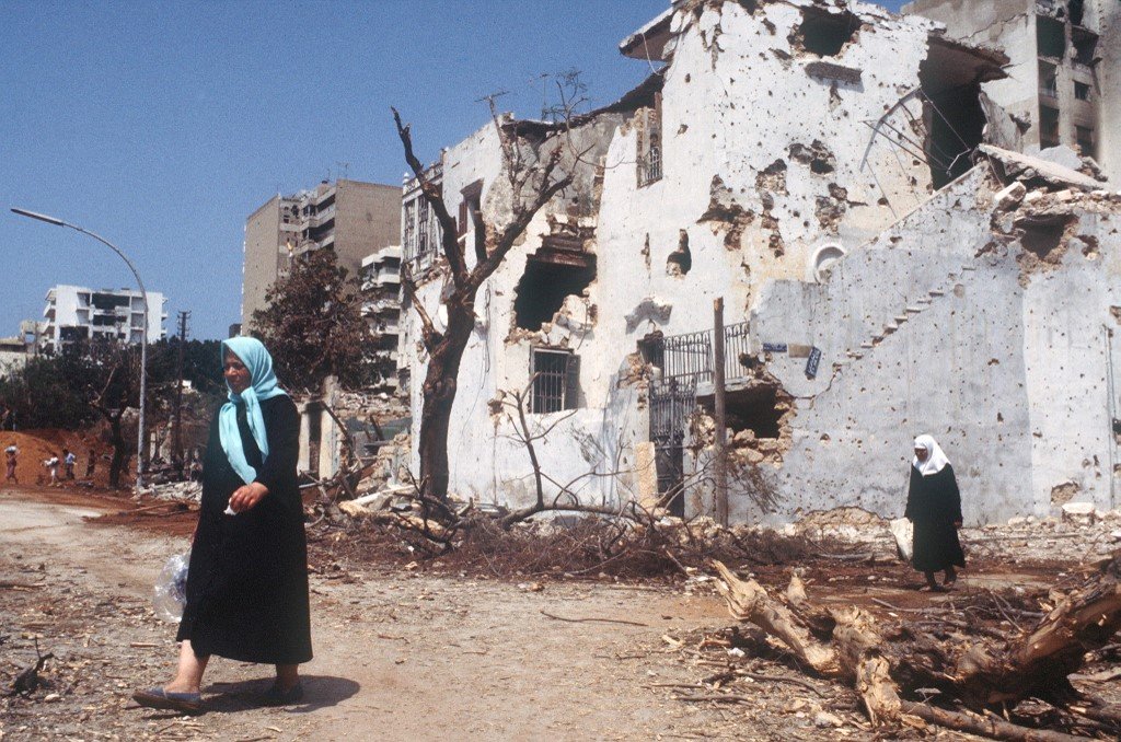 Lebanese women walk along a Beirut street devastated by Israeli shelling in 1982 (AFP)